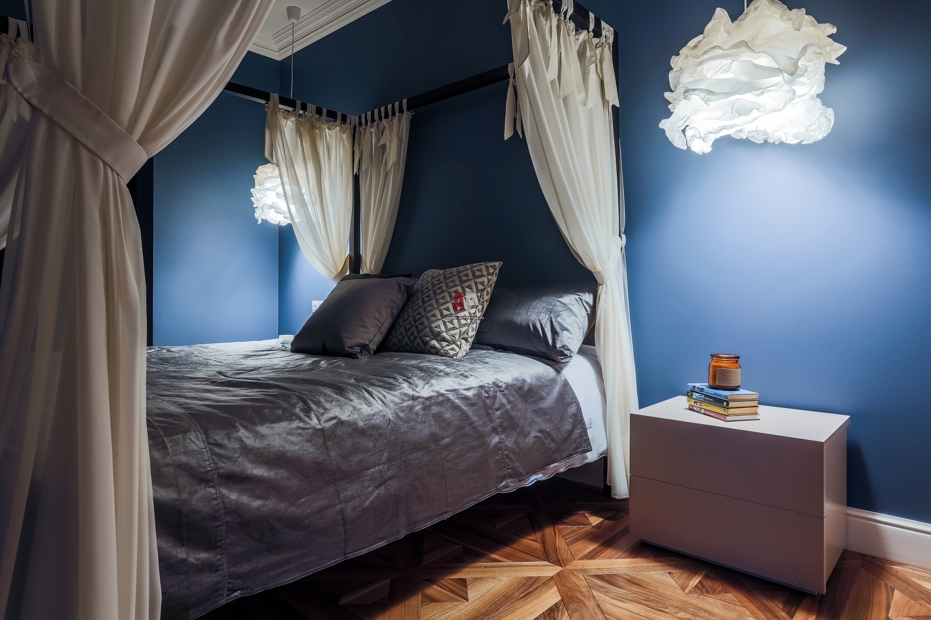 Спальня дочери. Стены выкрашены в насыщенный синий цвет Juniper Ash, № 115, Little Greene. Кровать с балдахином Zanotta добавляет интерьеру морской романтики. Прикроватные тумбочки с белыми лакированными фасадами, Veneran.