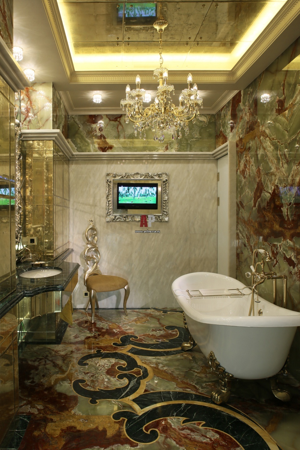 Интерьер женской ванной комнаты. Стены и пол выложены ониксом оливково-янтарного цвета с инкрустацией из черного полированного мрамора. Отдельно стоящая ванна на золотых лапах расположена напротив встроенного в стену плазменного экрана, обрамленного барочным золотым багетом.