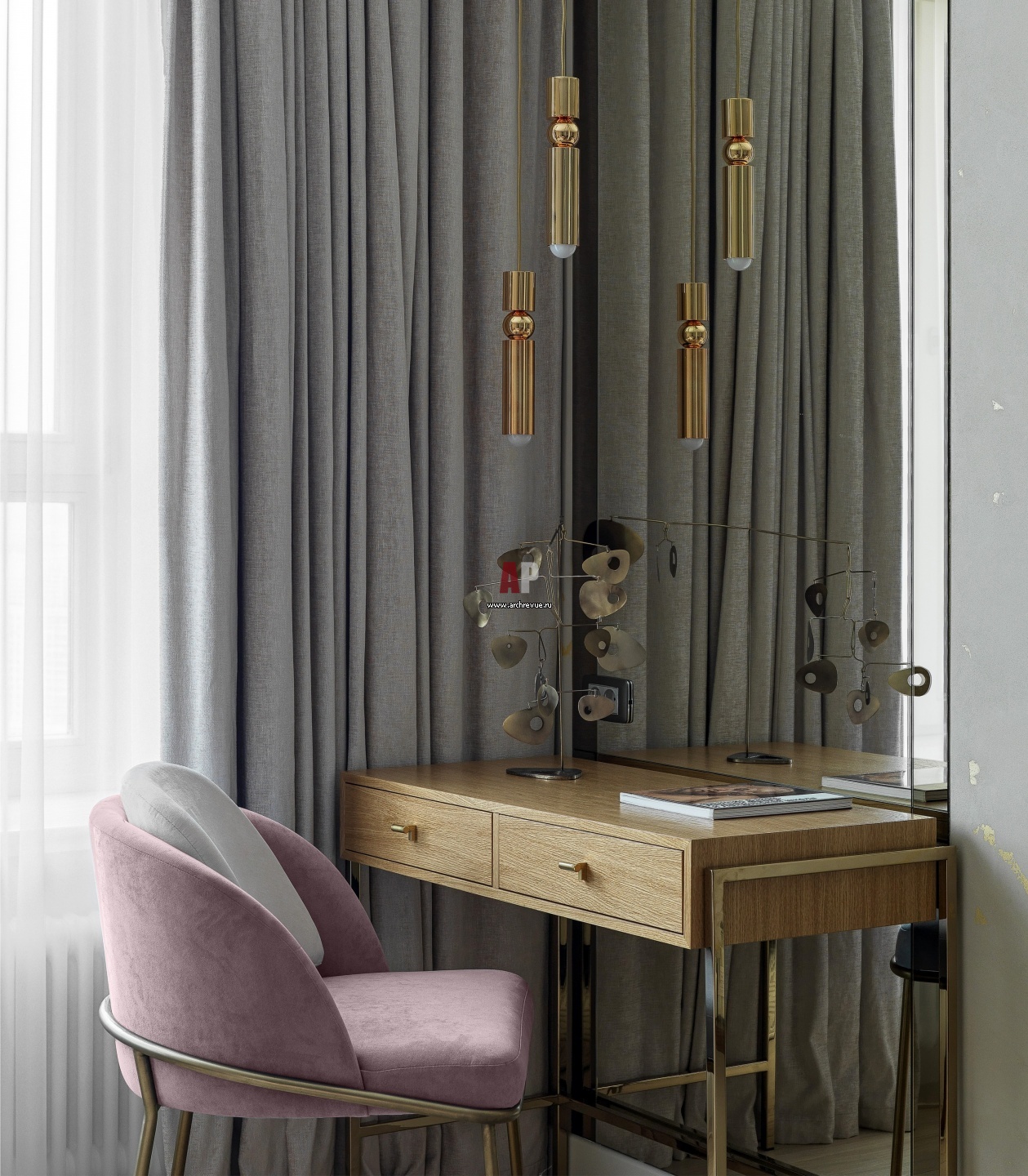 Прикроватные тумбы и туалетный столик сделаны на заказ. Подвесные светильники, Lee Broom, модель Fulcrum Light Gold.