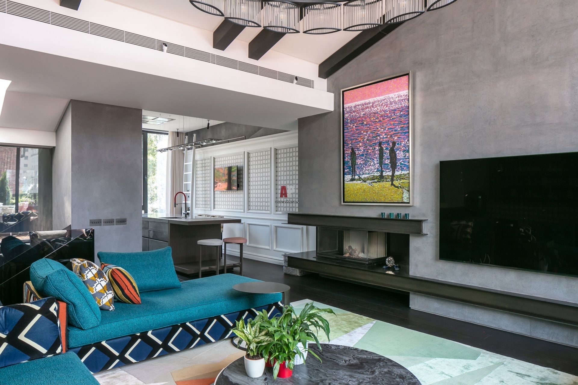 Зона отдыха в гостиной. Сложная конструкция потолка подчеркнута декоративными металлическими балками. Стена оформлена фактурой бетона.