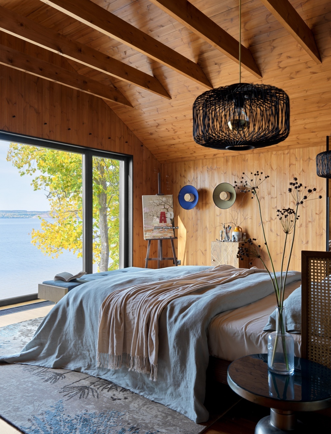 Хозяйская спальня. «Мне чувствуется, что это исключительно наш интерьер. Думаю, не все захотят поставить кровать по центру комнаты, напротив окна, для нас же это было единственное верное решение. Чтобы каждый раз, просыпаясь, наблюдать нереальную картинку природы, как меняется небо и вода из-за погоды… Это до мурашек по коже», - рассказывает архитектор.