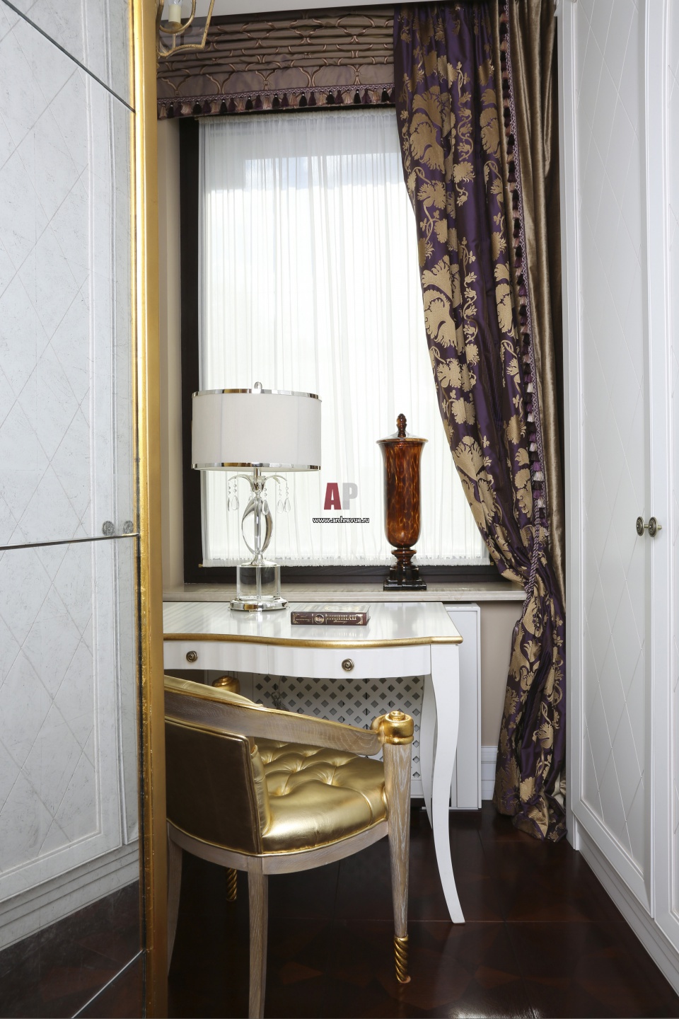 Интерьер дамского кабинета со столярными изделиями с белой эмалью. Шоколадные шторы подобраны на контрасте.