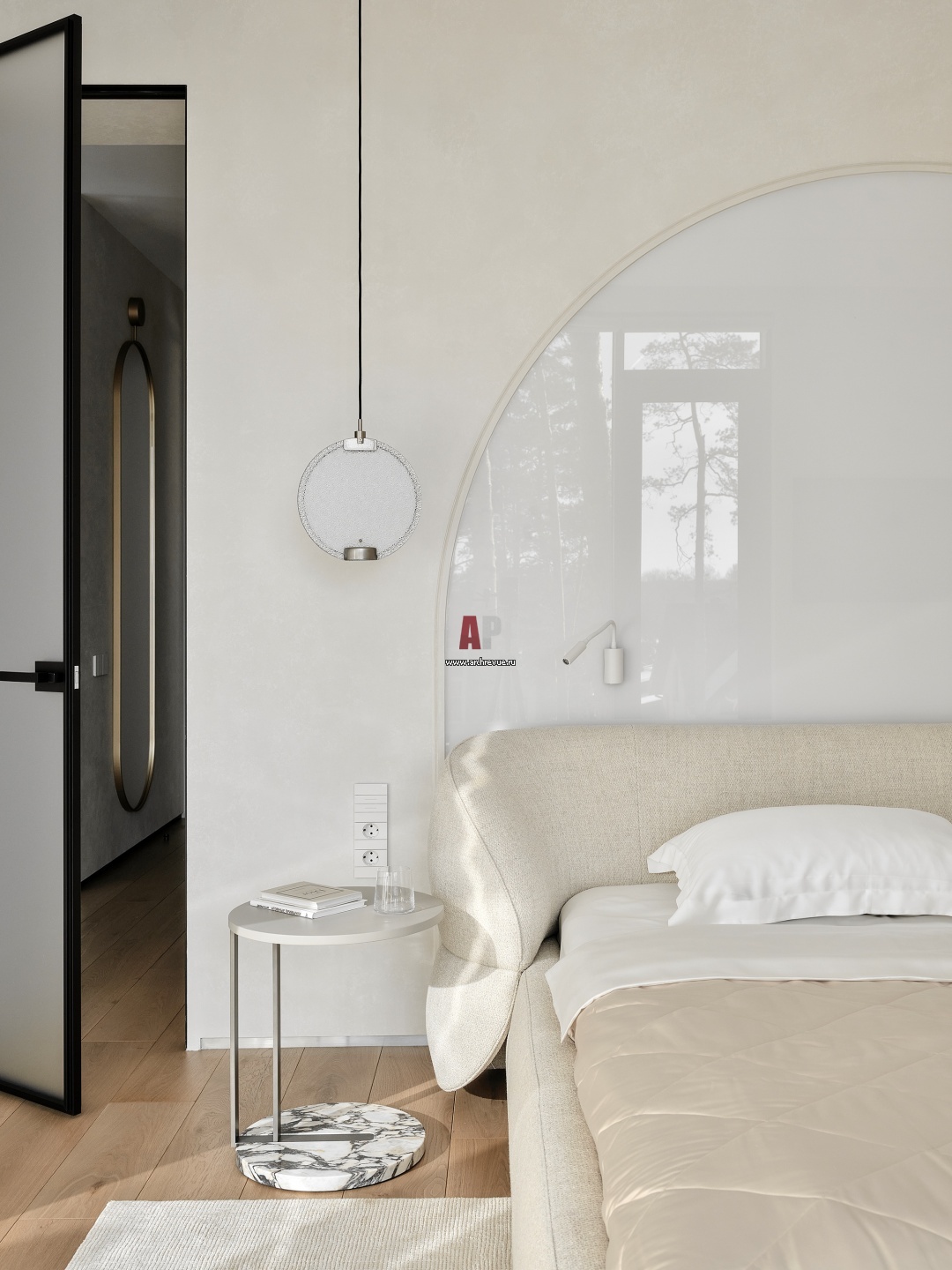 Мастер-спальня. Над кроватью – декор из молочно-белого из стекла в виде арки. Кровать и кресло, DiTre Italia, модель CLIP. Прикроватный столик, Meridiani, модель RALF. Светильники подвесные, Masiero, модель Horo S1.