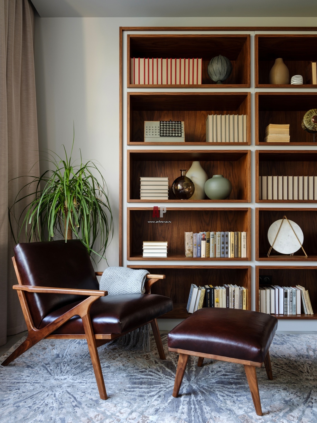Кабинет на первом этаже отделен от общей зоны стеклянной стеной. Стеллаж сделан на заказ. Кресло, Crate and Barrel.
