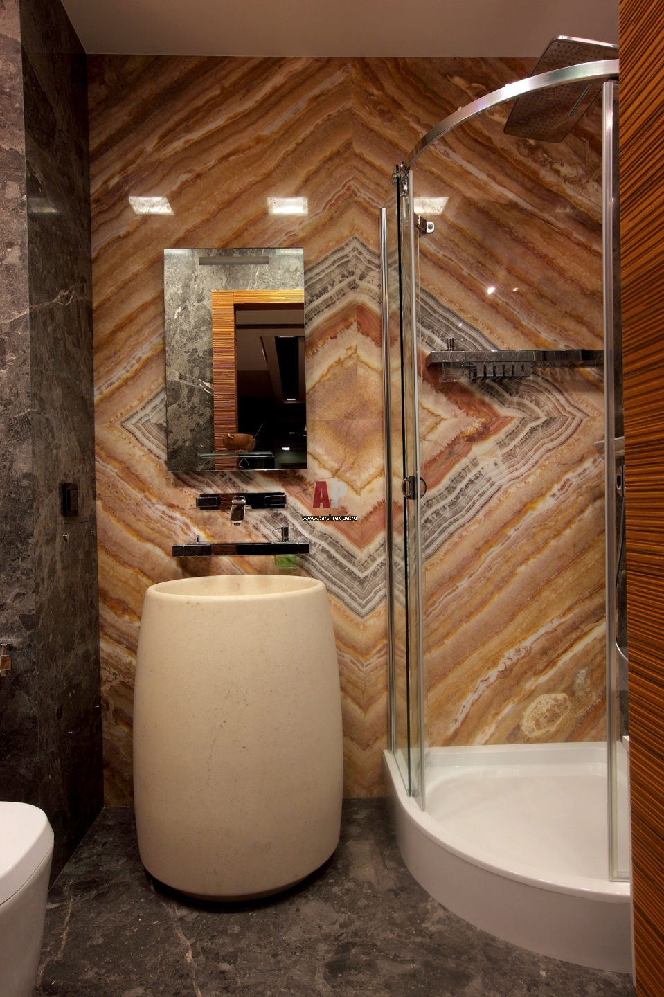 Стена гостевого санузла декорирована панелью из оникса, поставщик «Старк-Камень». Умывальник бионической формы, Antonio Lupi.