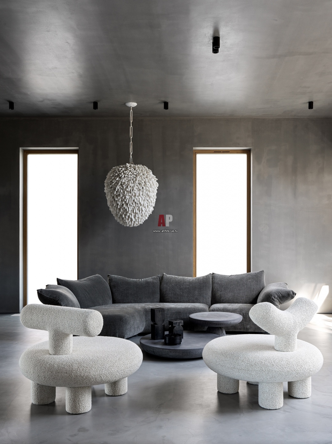 Бетонный дом в Подмосковье. Строительный бетон оставлять не стали (материал не соответствовал должному качеству), его фактуру воспроизвели современные штукатурка и микроцемент.