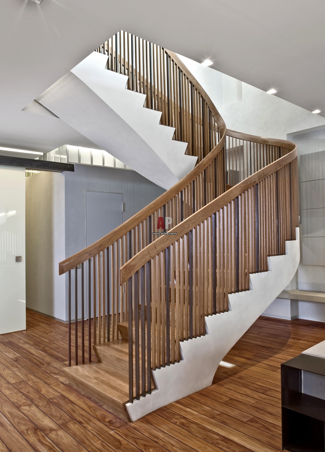 Авангардистская лестница похожа на скульптуру. Кажется, что она не примыкает к стене и парит в воздухе. Ограждение лестницы набрано из тонких деревянных реек.