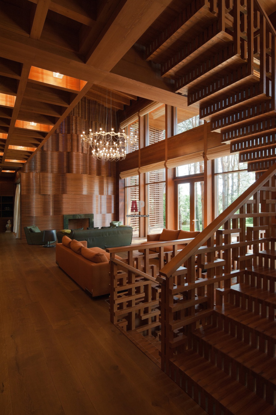 Гостиная в современном стиле оформлена деревом, которое сияет и золотится на свету.