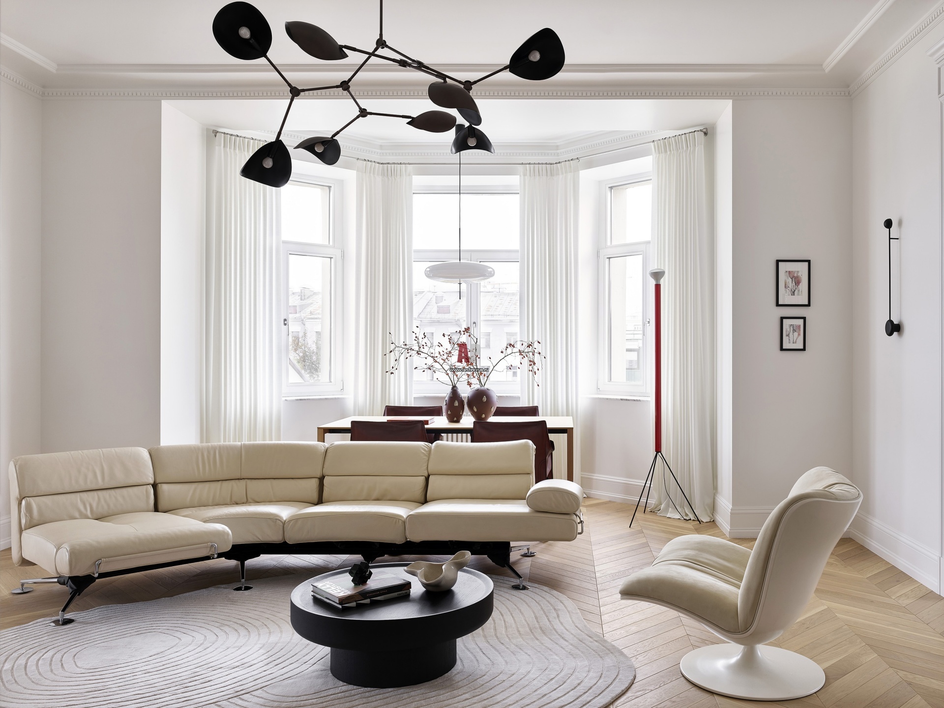 Гостиная. «Выбор дивана был довольно долгим, поскольку он находится в анфиладе. Большинство моделей были либо слишком грузными, либо чересчур нарядными. Поэтому встреча с винтажным диваном-трансформером De Sede, DS 470 по дизайну Томаса Альтхауса, оказалась судьбоносной. Его футуристический облик и гармоничные пропорции подчеркивают логику движения и не перекрывают центральную ось от балюстрады балкона детской до балюстрады балкона кабинета», - рассказывает дизайнер.