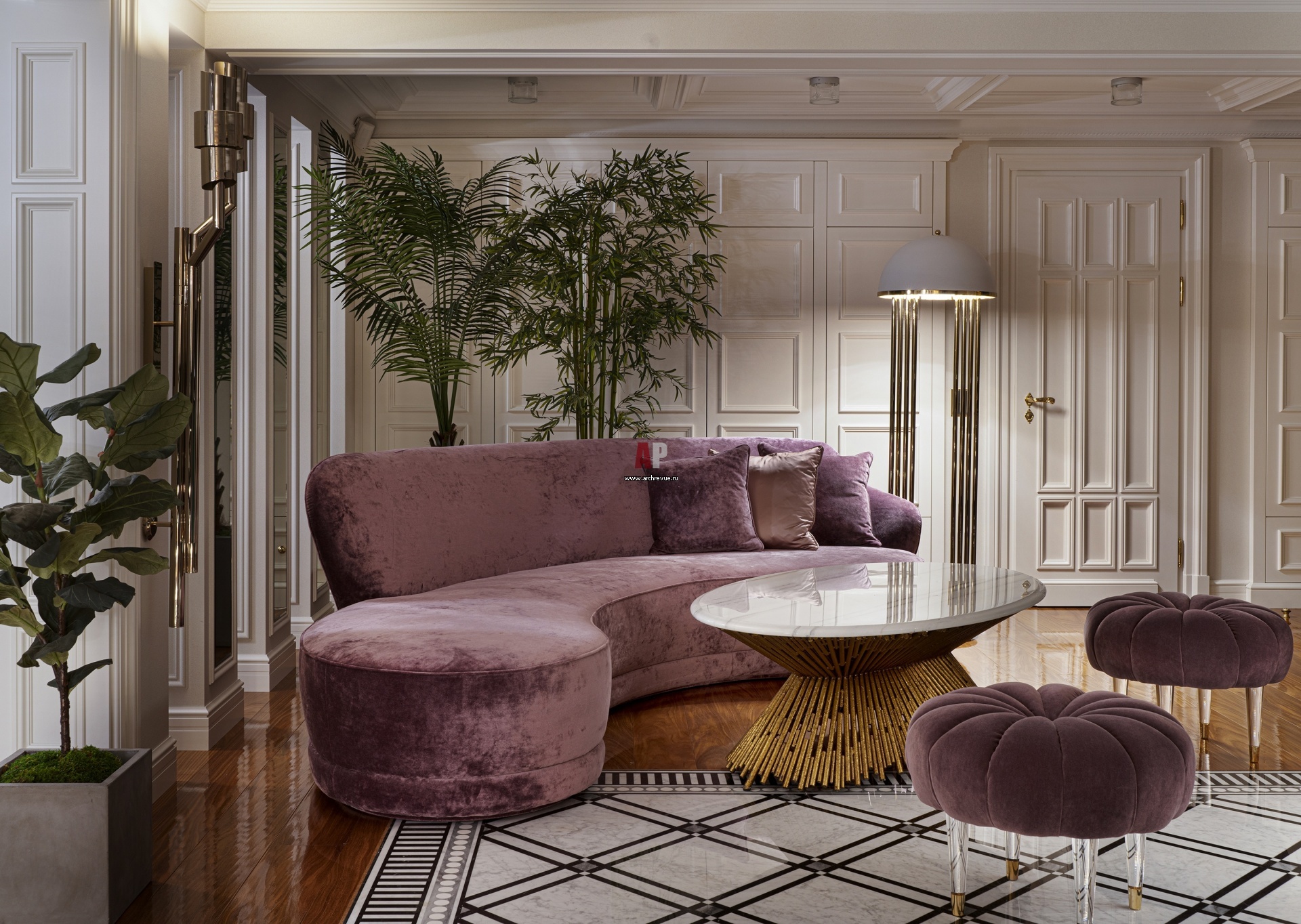 Диванная группа в цоколе. Сиреневые диваны обтекаемой формы, Paolo Castelli. Столик, Ambella Home.