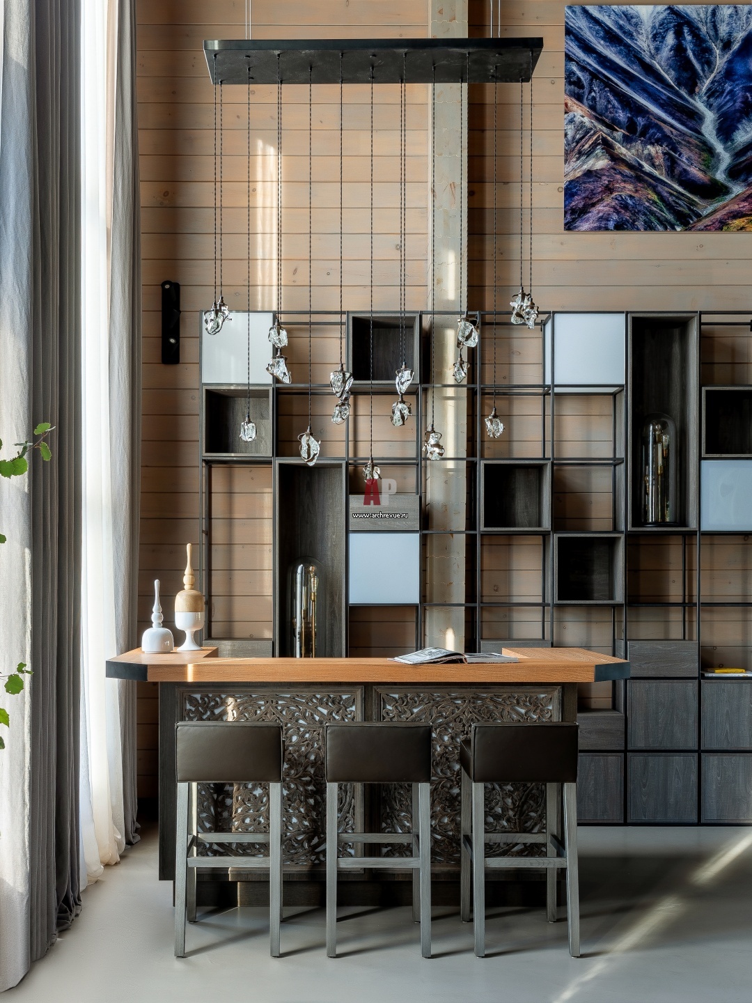 Полки за баром сделаны на заказ. Основание барной стойки оформлено панно из ажурного металла со встроенной подсветкой. Светильник с подвесами, Maretti. Барные стулья, Piet Boon, модель Saar.