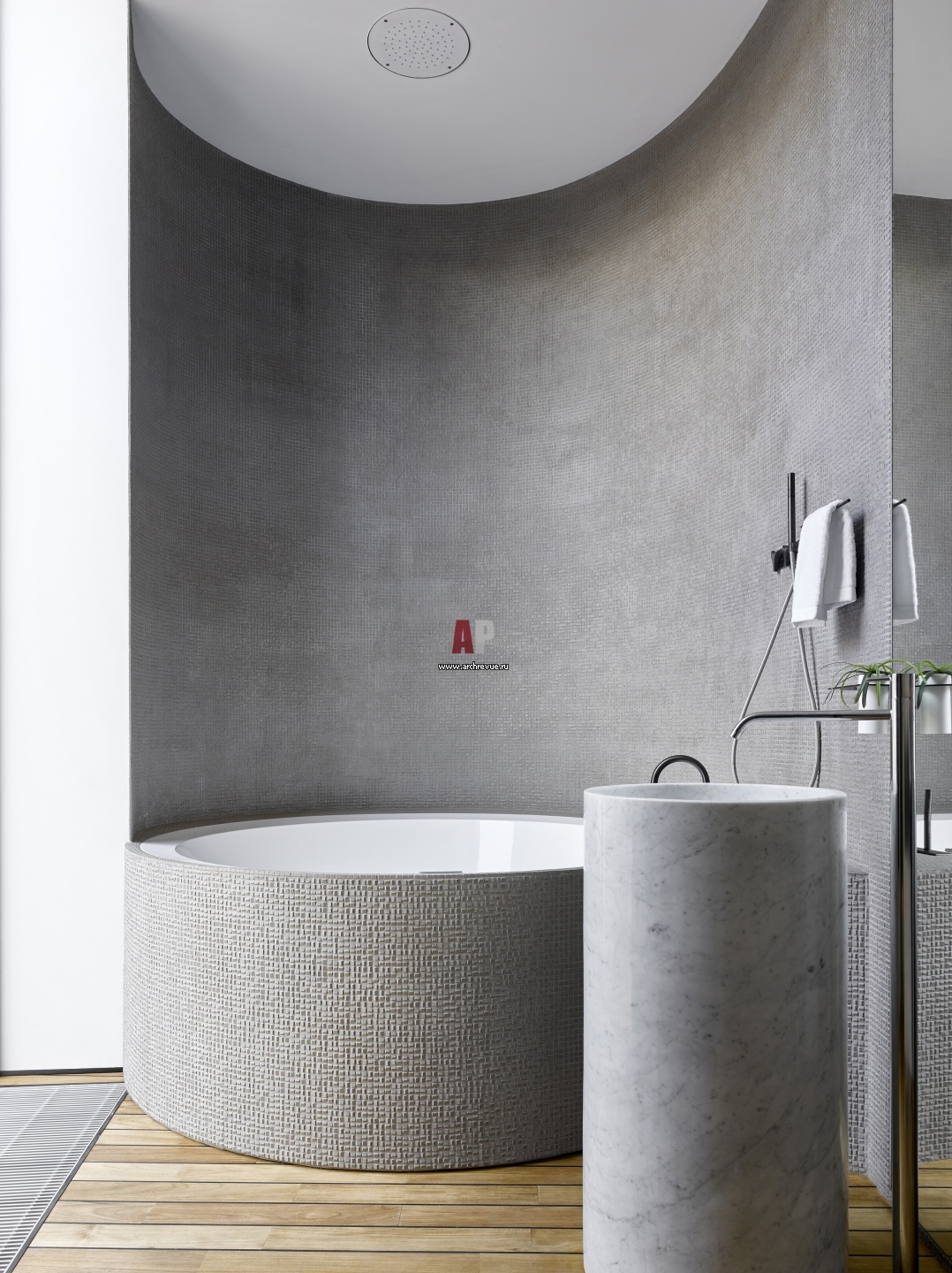 Ванная комната на первом этаже. Круглая стена и фасад ванны облицованы серой каменной мозаикой. На полу – тиковое покрытие. Раковина сделана на заказ из цельного камня. Сантехника, Antonio Lupi, Cea.