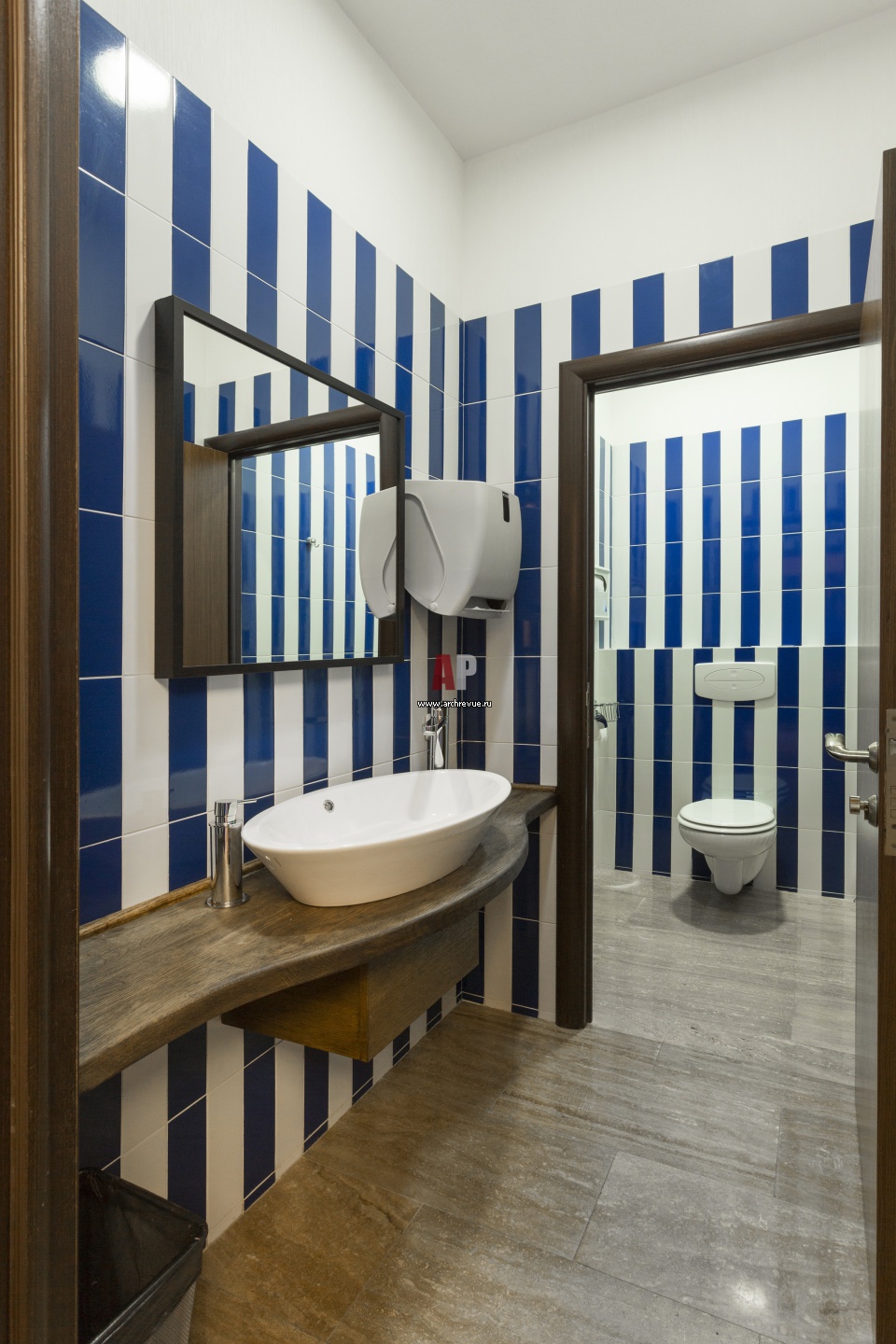 Фото санузла в морском стиле. Стены отделаны плиткой Kerama Marazzi в бело-синюю полоску. Подстолье для раковины выполнено из продольного спила дерева.