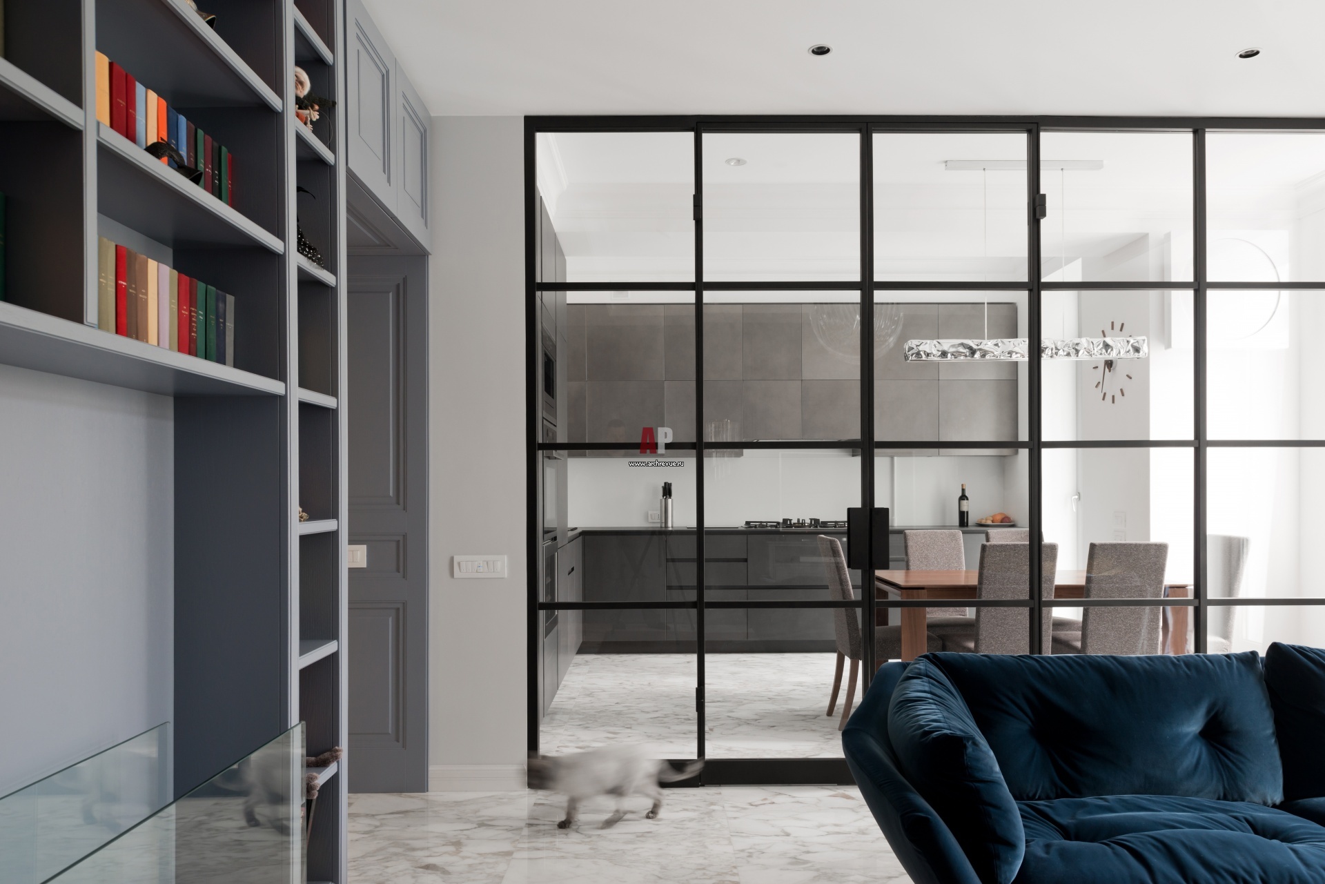 На контрасте с неоклассическими буазери в гостиной появилась брутальная стеклянная перегородка в черном металлическом обрамлении.