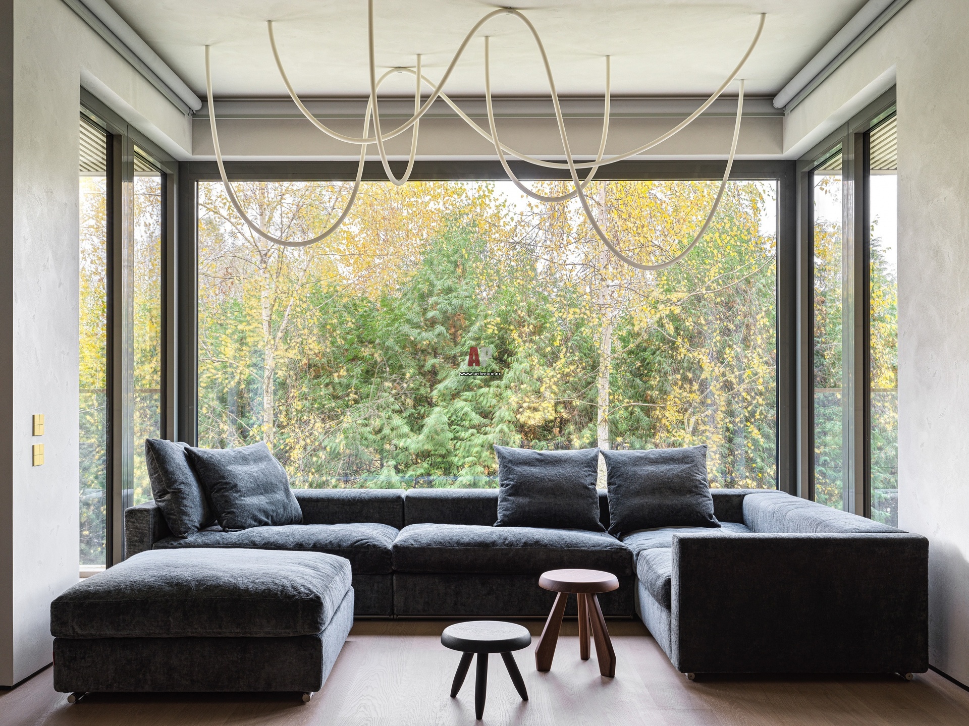 Зона отдыха в эркере. Диван, Flexform. Мини-столики, Cassina. Авангардный светильник, Centrsvet.