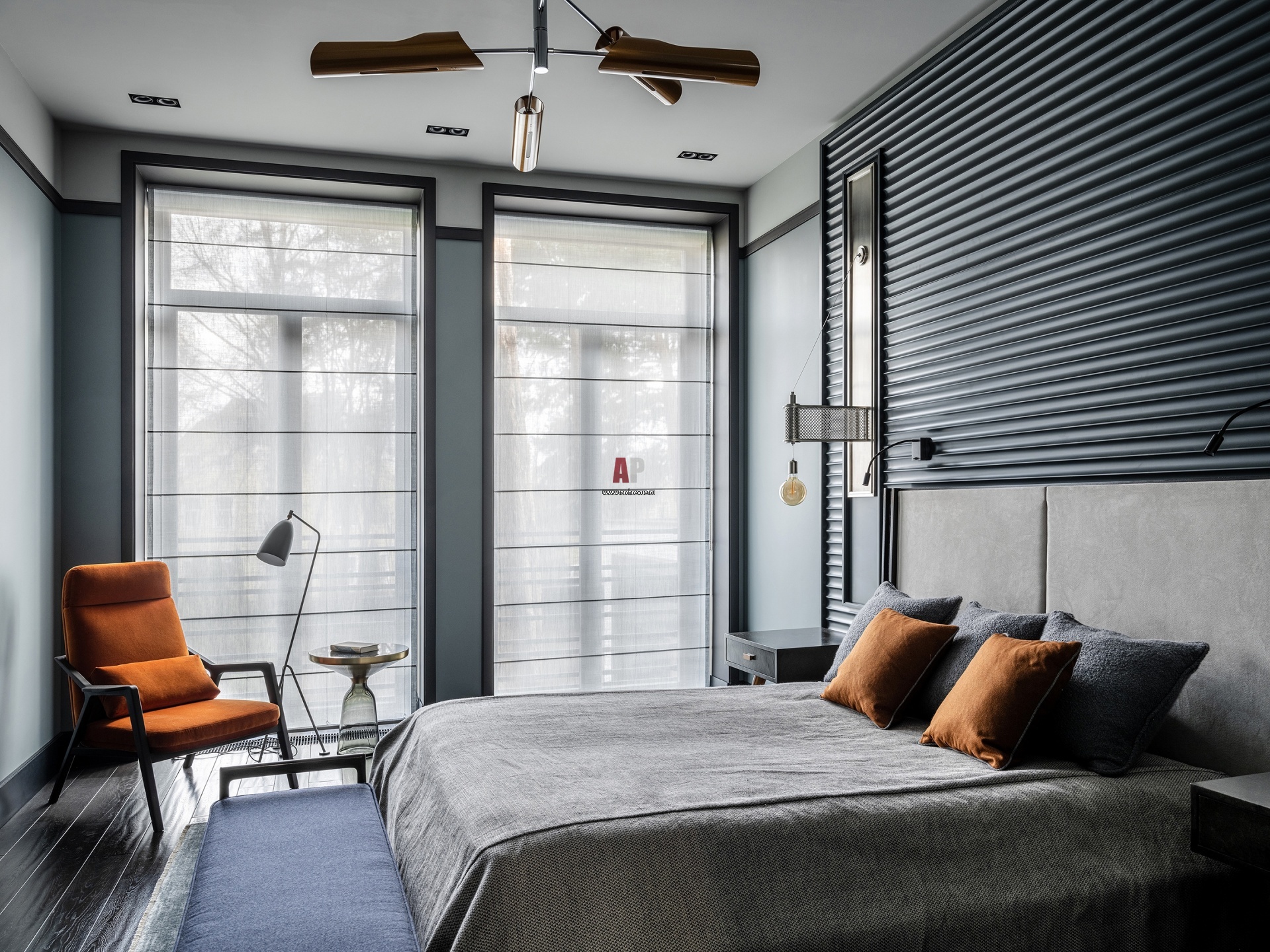 Комната младшего сына оформлена в стиле лофт. На стенах – бетонные панели. На полу – тонированное до черноты дерево. Кресло, Porada. Столик, ClassiCon. Банкетка, Julian Chichester.