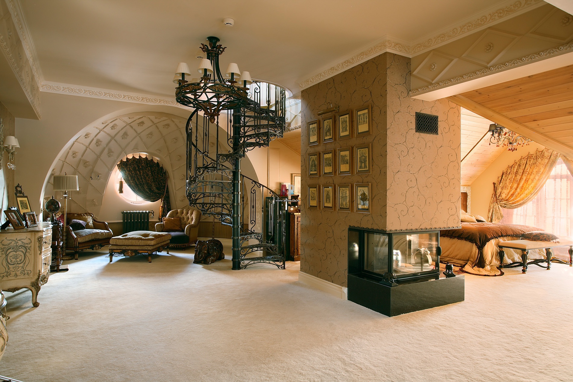 Интерьер спальни в классическом стиле. Пространство разделено на несколько зон: спальную, каминную, будуара. Винтовая литая лестница ведет в кабинет хозяина дома.