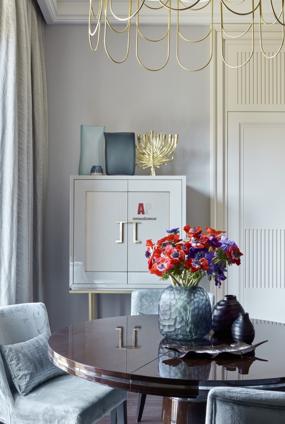 Интерьер столовой. Шкаф для посуды Frato с элементами шинуазри. Ваза на столе, Guaxs. Подсвечник, Michael Aram.