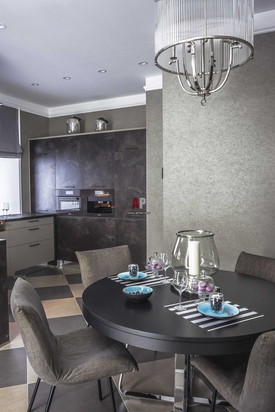 Кухня вынесена в изолированное помещение, помимо рабочей зоны и острова в ней размещен столик для семейных завтраков. Стол, стулья, Ligne Roset.