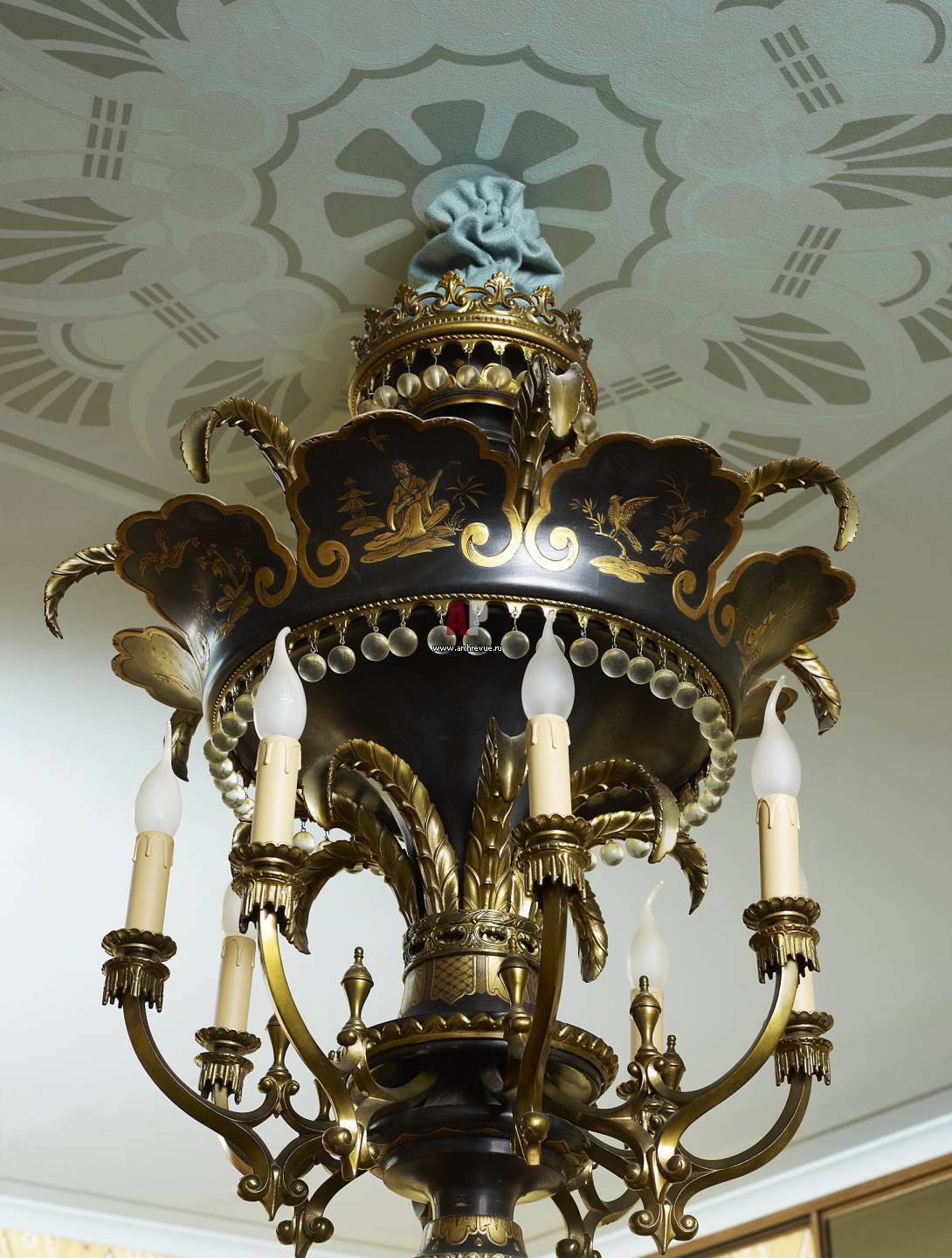 Потолок парадных помещений украшен росписью.