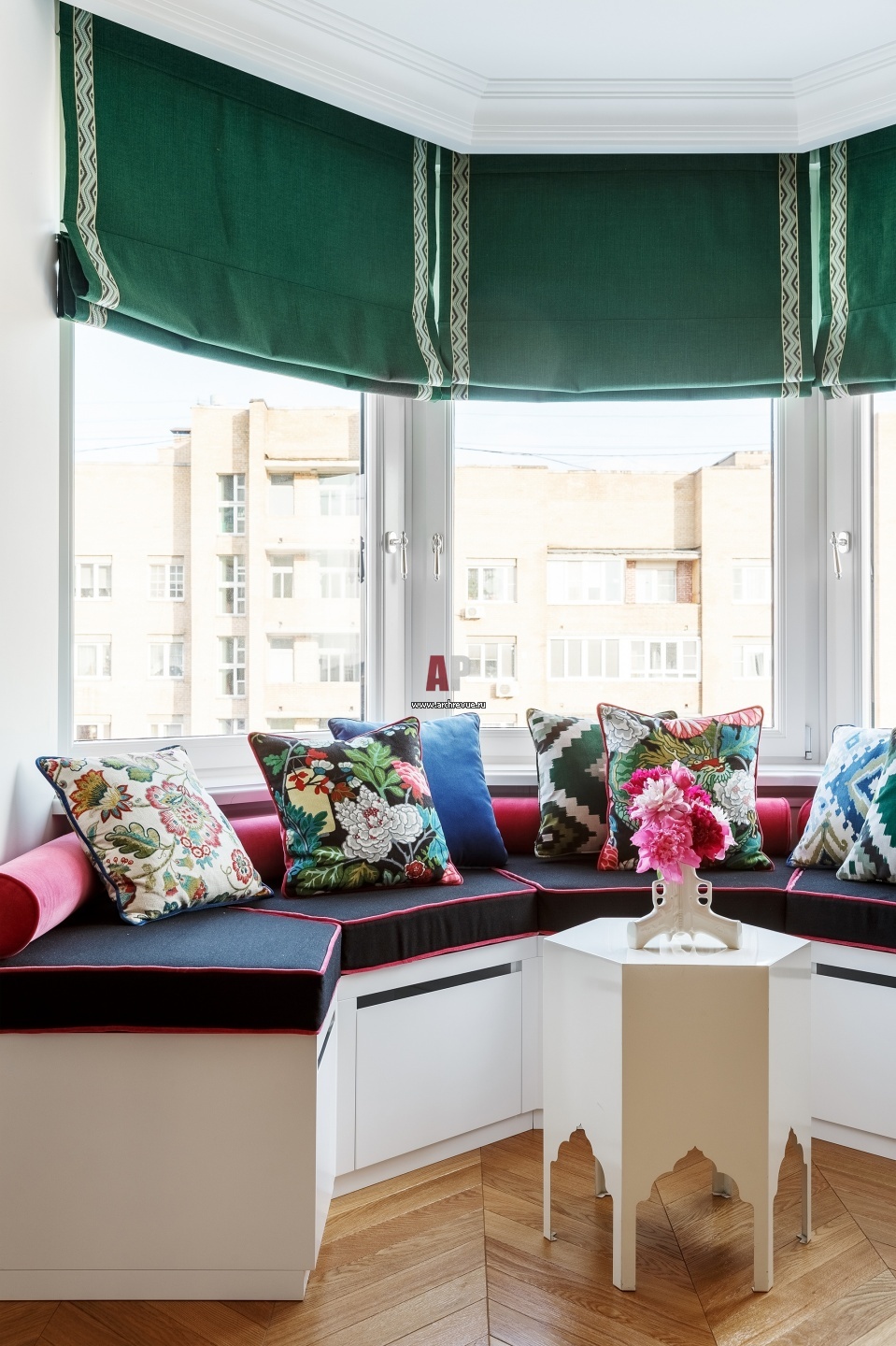 Детская комната. В эркере сделана удобная лаунж-зона со множеством разноцветных подушек.