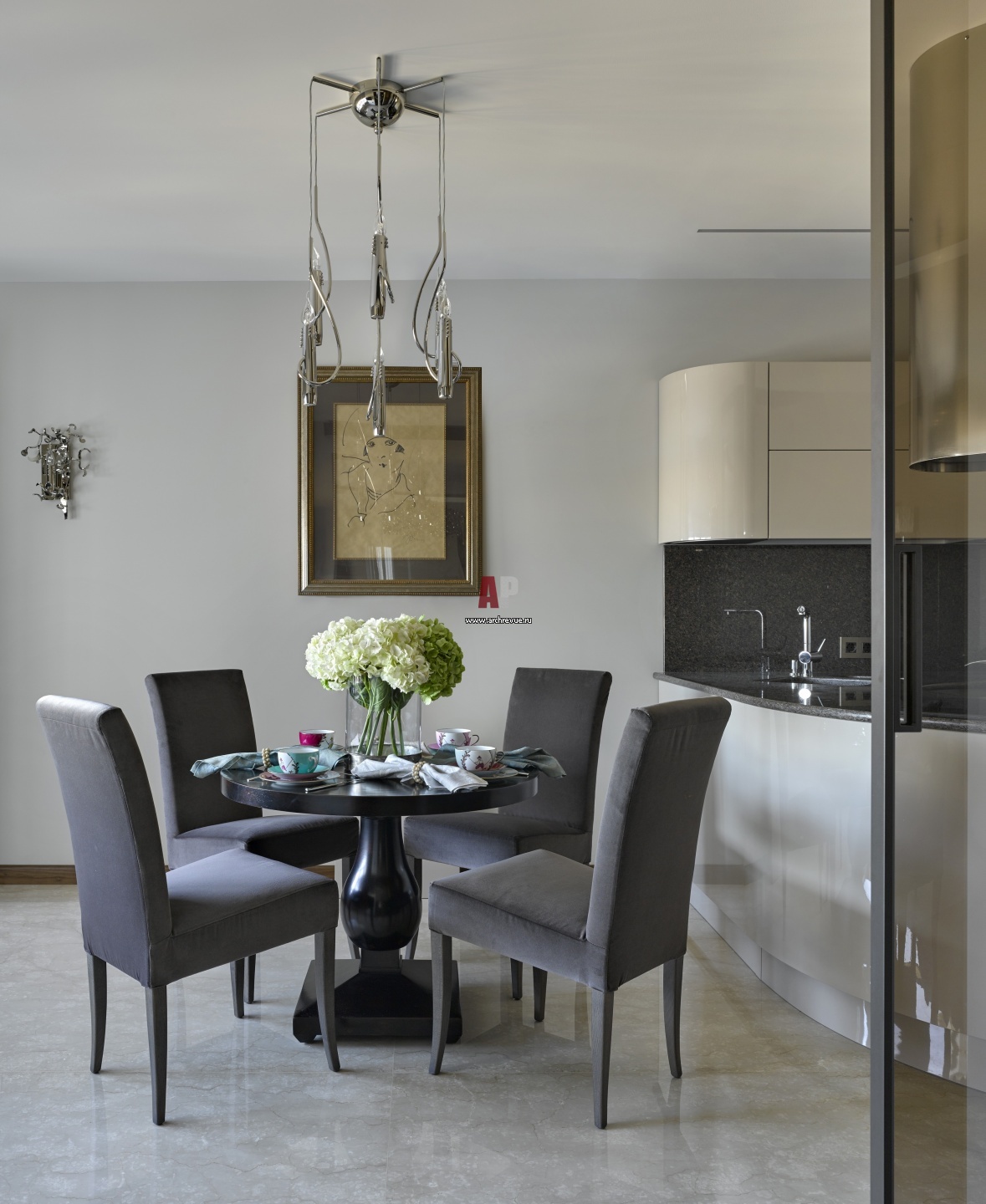 Кухня-столовая выполнена в современном стиле с элементами ар-деко. Фасады кухонного гарнитура Pedini выполнены из белого лака и эбенового дерева.