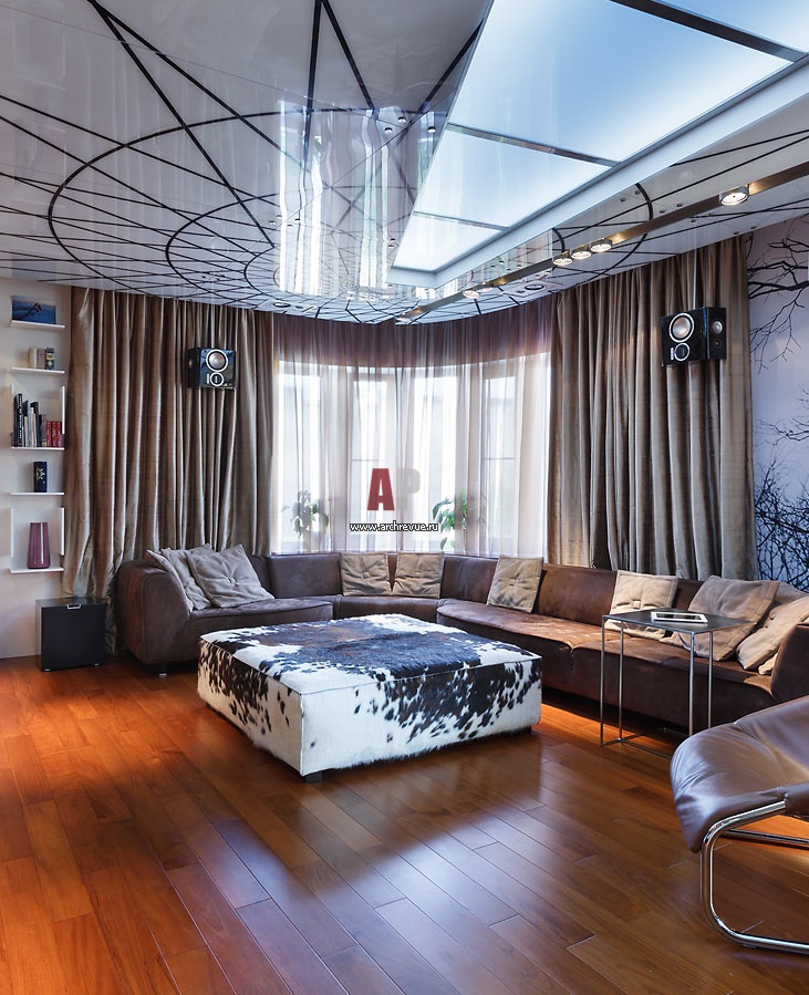 Изображение Шуховской башни украшает потолок центральной гостевой зоны. Баннеры закрыты стеклом, в центре размещен световой фонарь, отчего создается ощущение, будто находишься внутри сетчатой оболочки сооружения и смотришь наверх, где небо, солнце и черные силуэты раскидистых ветвей деревьев. Угловой диван, Gamma Arredamenti.
