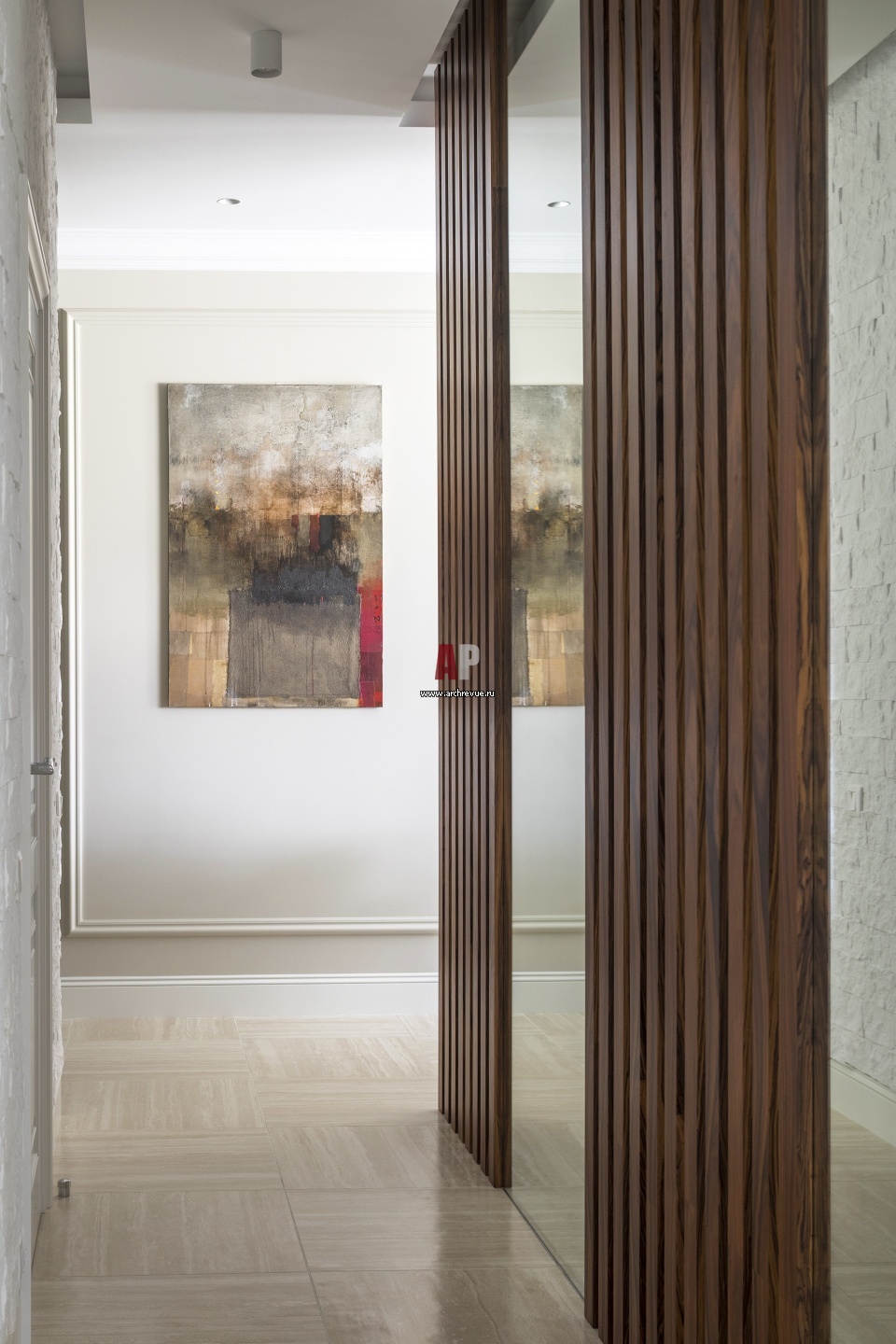 Входная зона. Аскетичность декора стен усложняют панели в виде вертикальных деревянных рек.