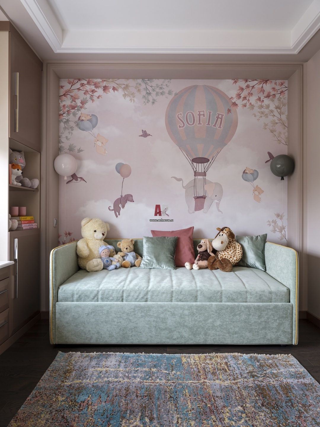 Детская исполнена в нежных пыльно-розовых оттенках («розовый кварц»). Кровать, Dream Land. Светильники, Brokis, модель Memory.