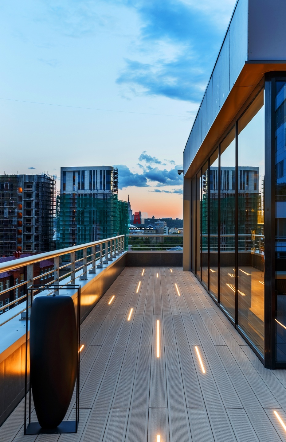 Панорамный пентхаус в Хамовниках. Терраса на крыше. Террасная доска оформлена встроенной подсветкой, она задает маршрут движения и придает динамику.