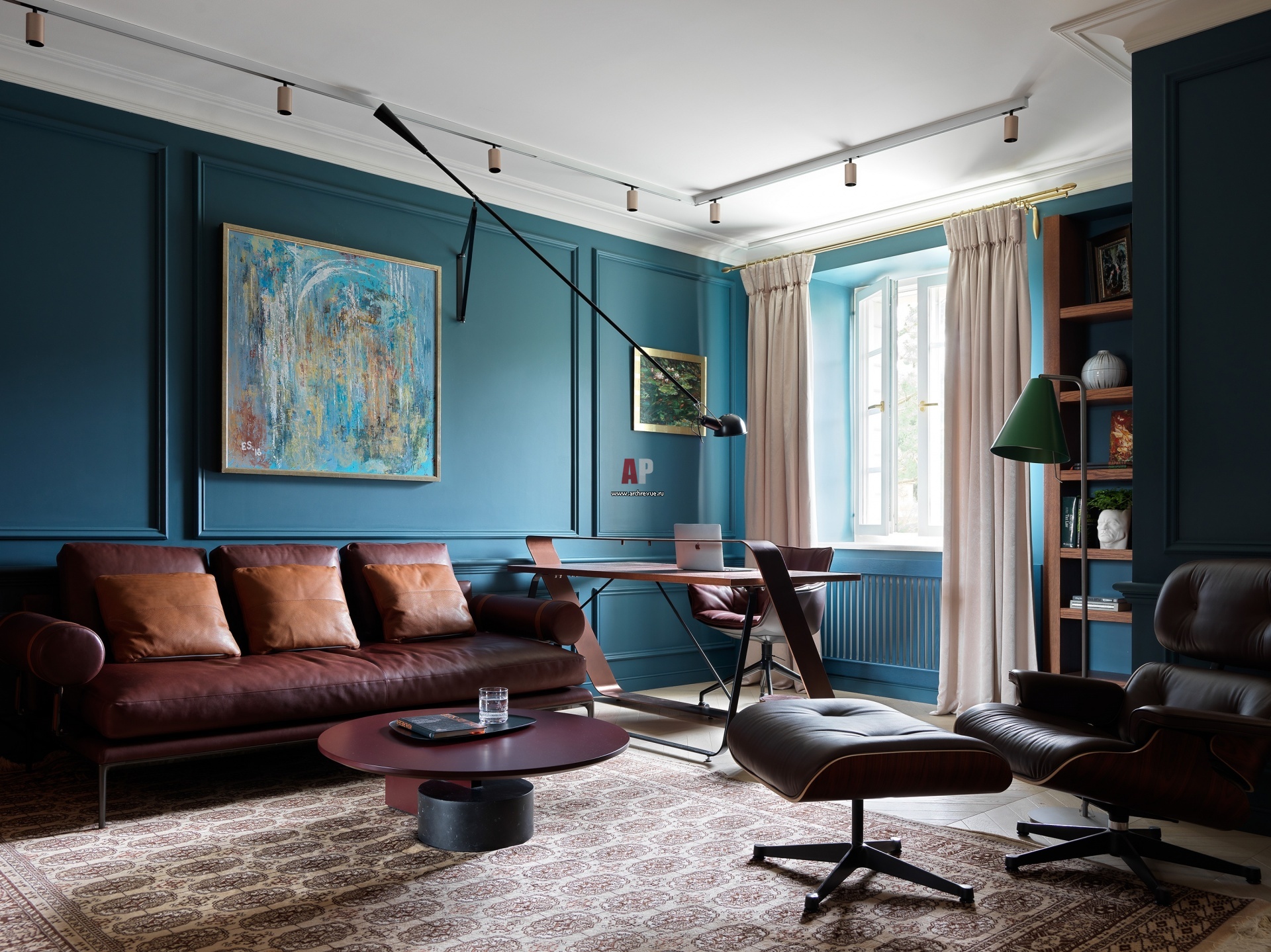 Кабинет с мебелью в стиле 1970-х годов. Стены выкрашены матовой краской Dyrup в сложный синий оттенок. Книжный стеллаж из массивных балок и письменный стол из металла с массивной столешницей изготовлены на заказ. Кожаный диван, B&B Italia. Лакированный столик, Cassina. Картина над диваном – художница Елена Сотникова Oxygen, 2018 год.