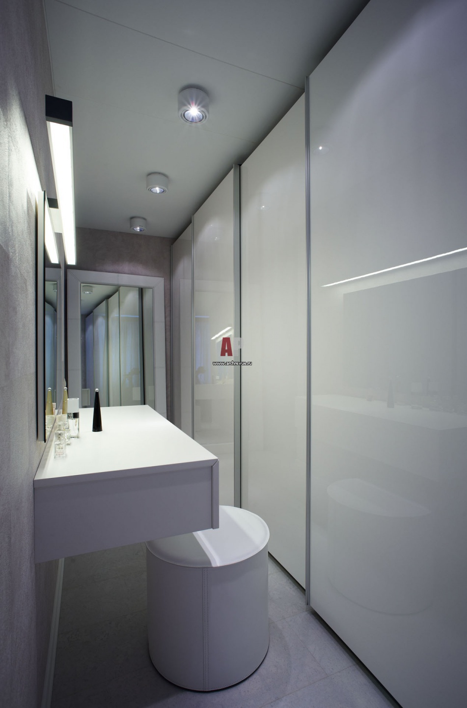 Дизайн небольшой гардеробной комнаты в современной квартире. Встроенный шкаф с глянцевыми раздвижными дверями. Небольшой туалетный столик с зеркалом.