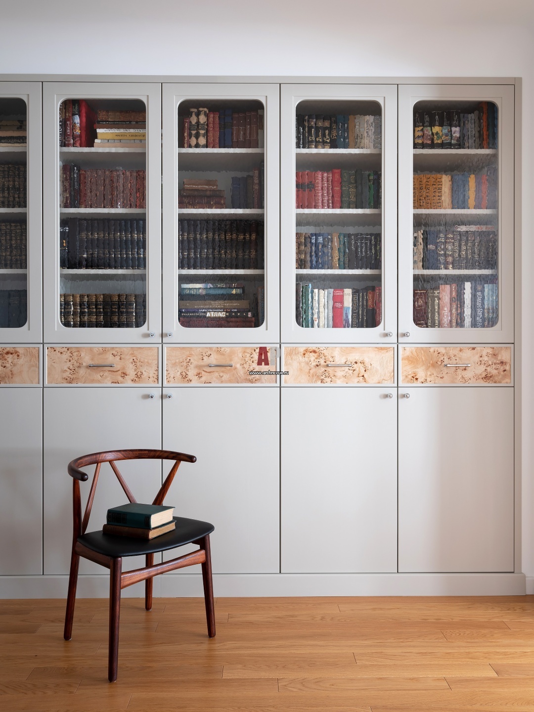 Библиотека в галерее. Встроенные шкафы со вставками корня тополя на заказ.