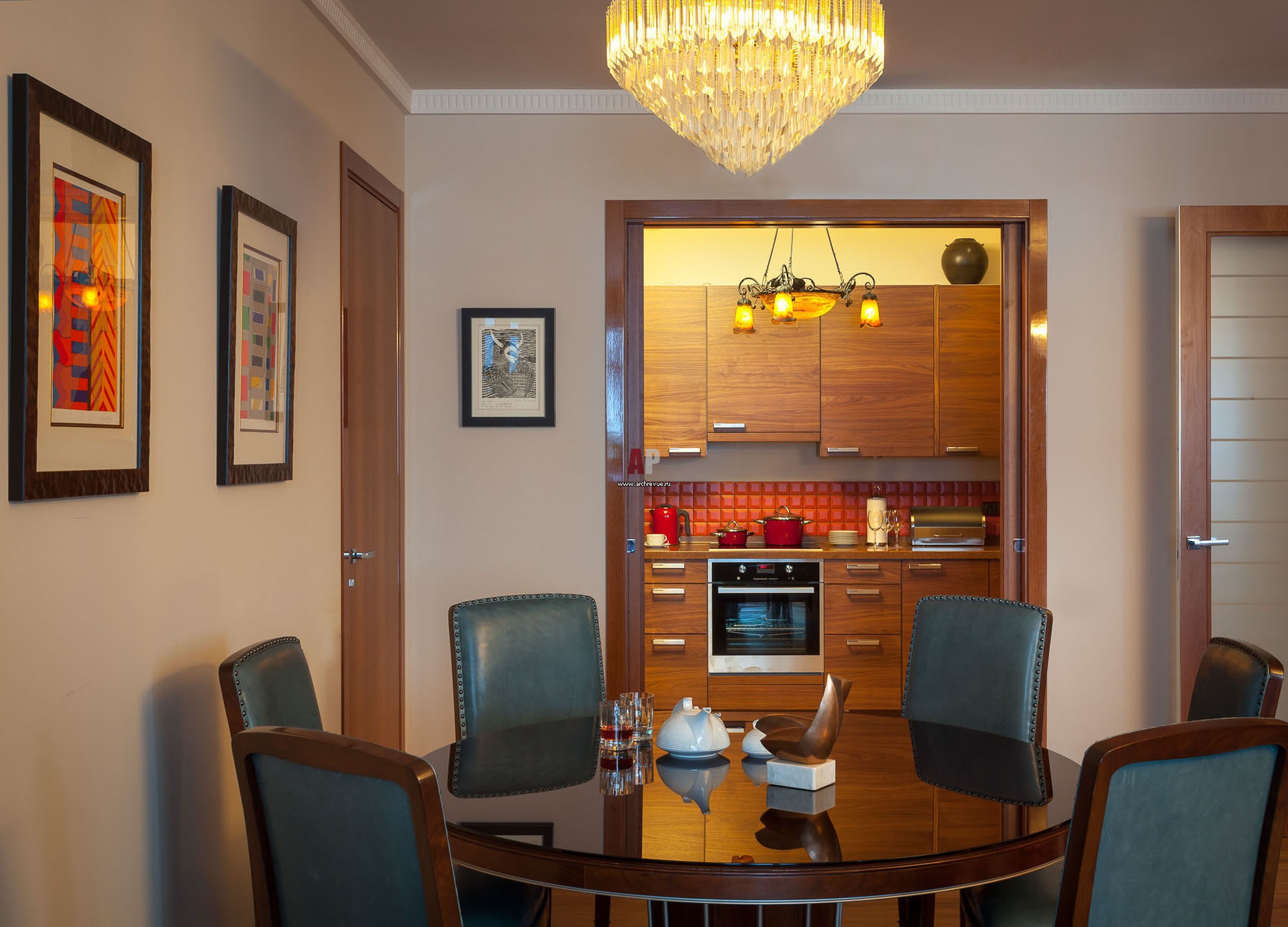Кухня находится в темной части квартиры, открытый широкий портал объединяет ее с общим гостевым пространством.