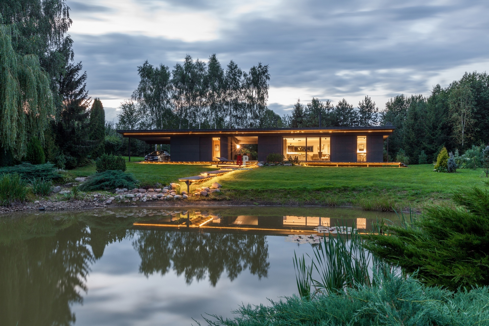 Современный каркасный дом на озере. Фасад при вечернем освещении. Ставни на монорельсах соединяют две части здания в единое целое, например, в зимнее время или непогоду, то есть закрывают сквозной проход.