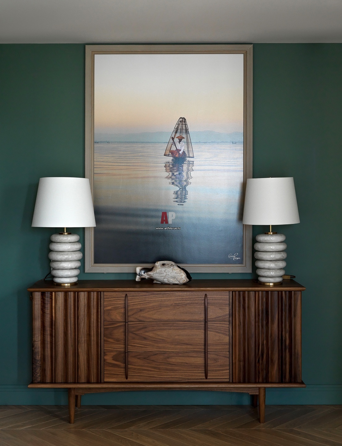 Фрагмент. Комод в стиле mid-century с рельефными фасадами выполнен на заказ. Фотография рыбака, автор – фотохудожник Саша Генцис. Настольные лампы, Visual Comfort & Co.