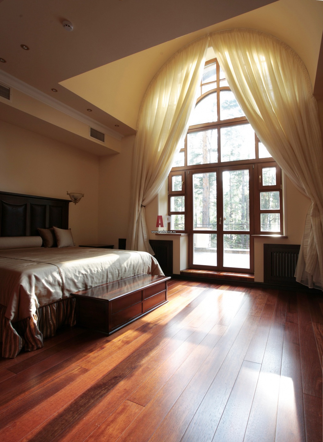 В интерьере спальни доминирует огромное окно в сложном переплете с полукруглым верхом.