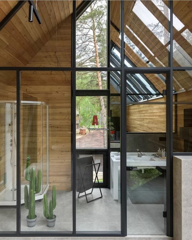 Санузел в спальне. Кровля подшита светлой лиственницей.