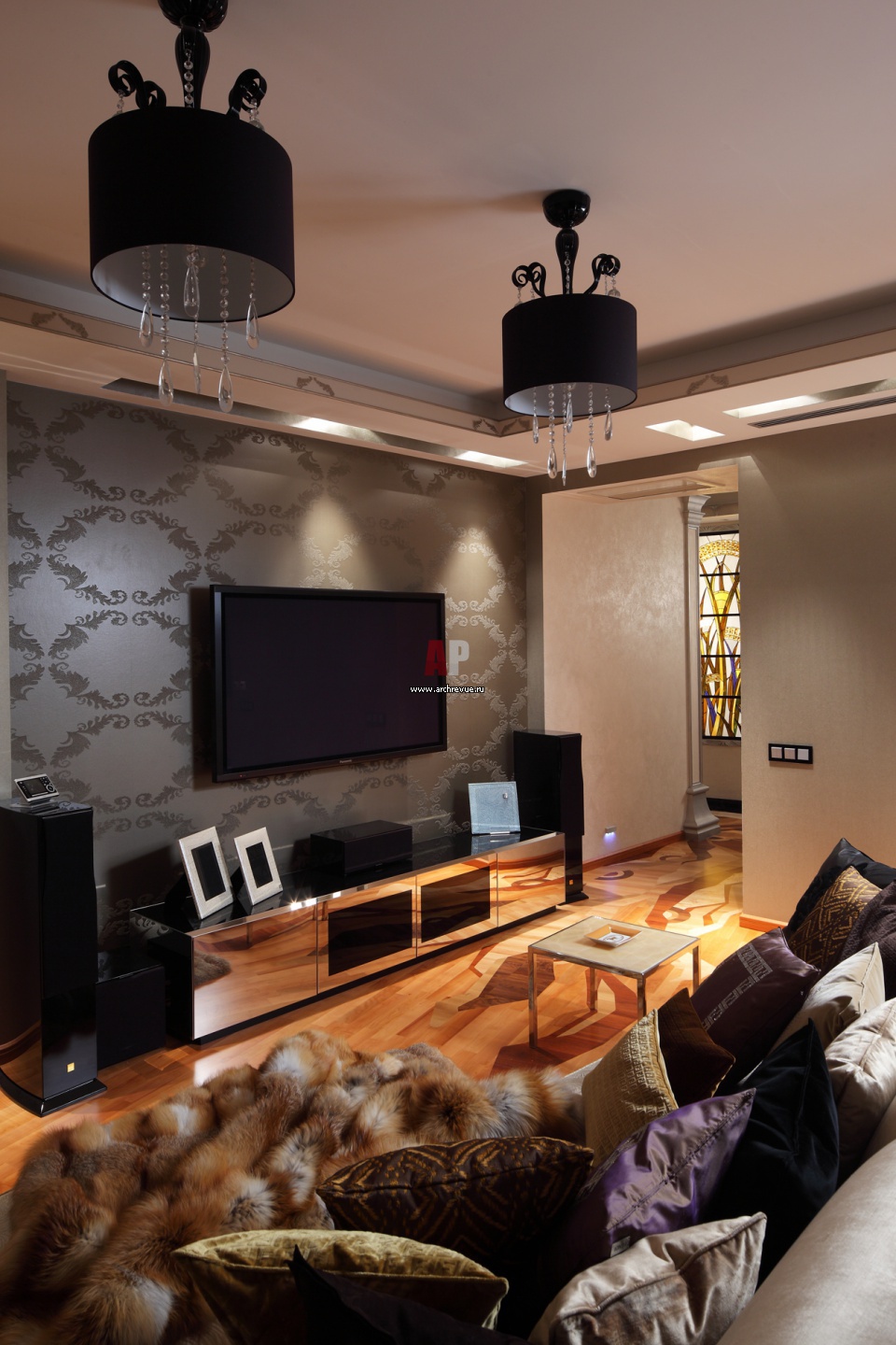 Зона домашнего кинотеатра в гостиной. Обои, Ulf Moritz, поставщик «Идеал-Интерьер». Художественный паркет, поставщик «Ковчег-паркет». Светильники, Barovier & Toso.
