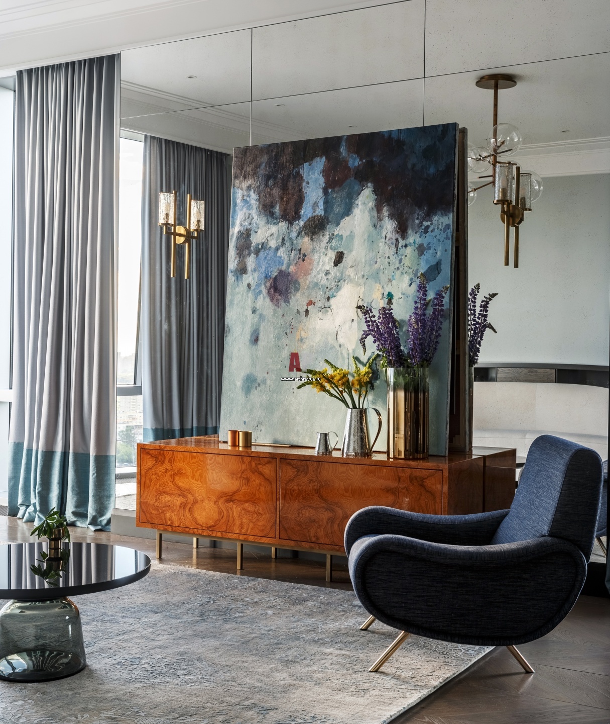 Интерьер гостиной. Тумба в стиле mid-century сделана на зака. За ней – стена из состаренного зеркала, она маскирует выступ стены (на 40 см относительно окон).