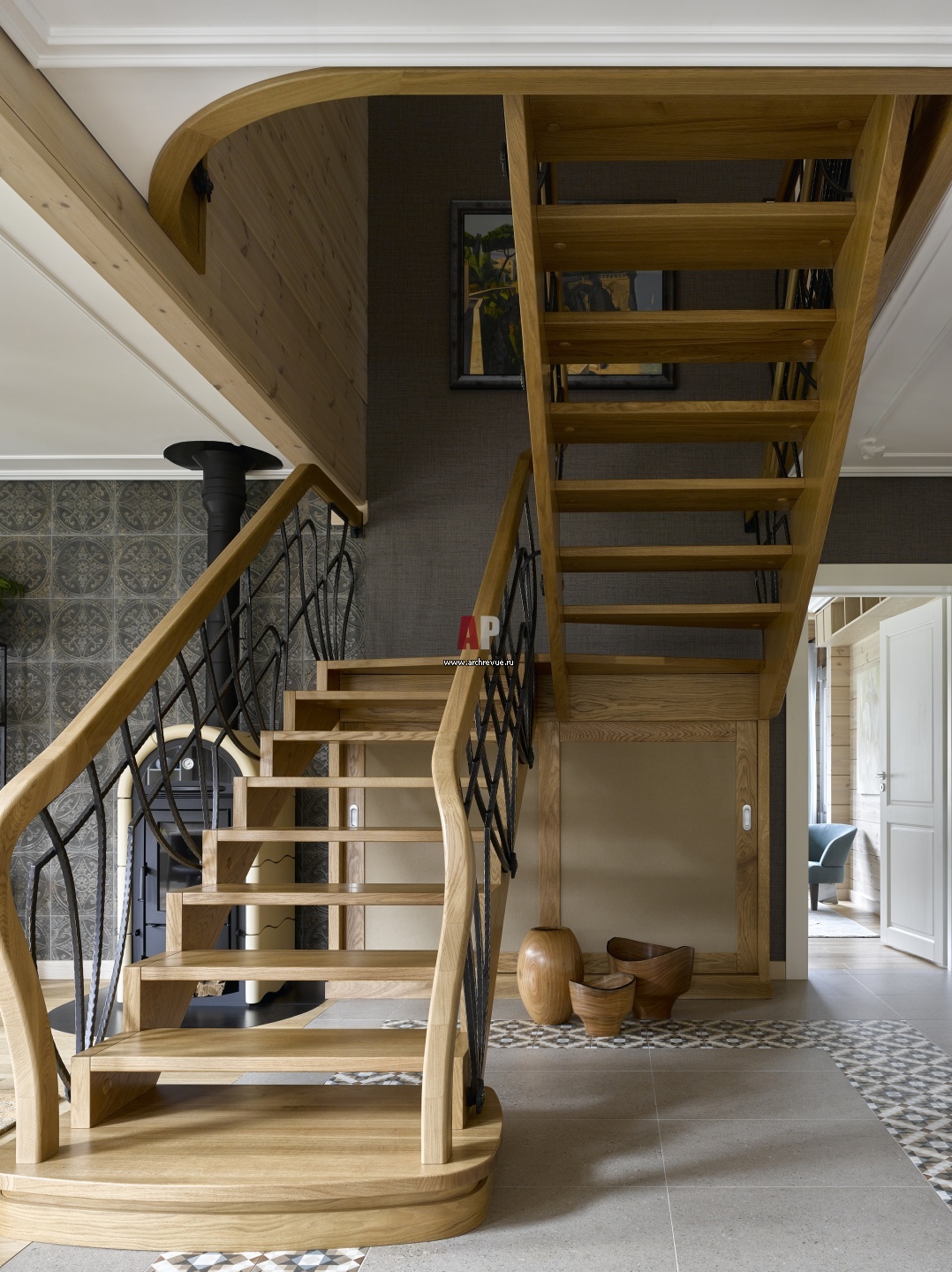 Лестница в доме разработана специально для этого проекта и представляет собой интересный художественный элемент, который связывает пространство в центре дома. В ее конструкции использовано несколько материалов: кованый металл и дерево в том числе гнутое.