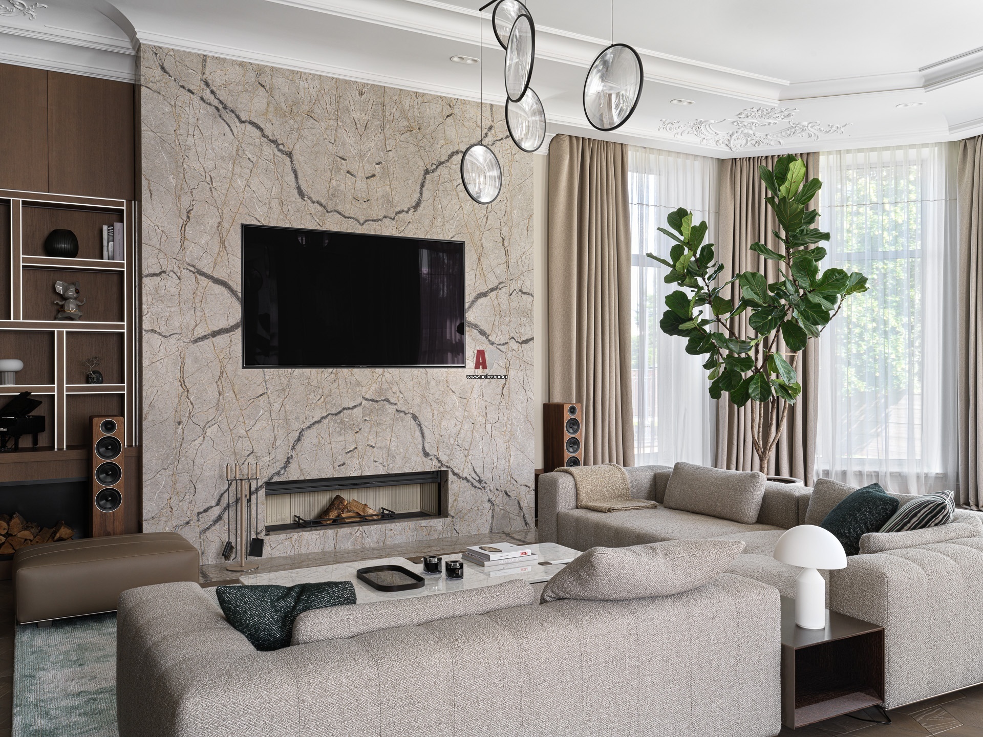 Каминная группа с домашним кинотеатром оснащена профессиональной акустической системой. Стена отделана мрамором, Silver roots.