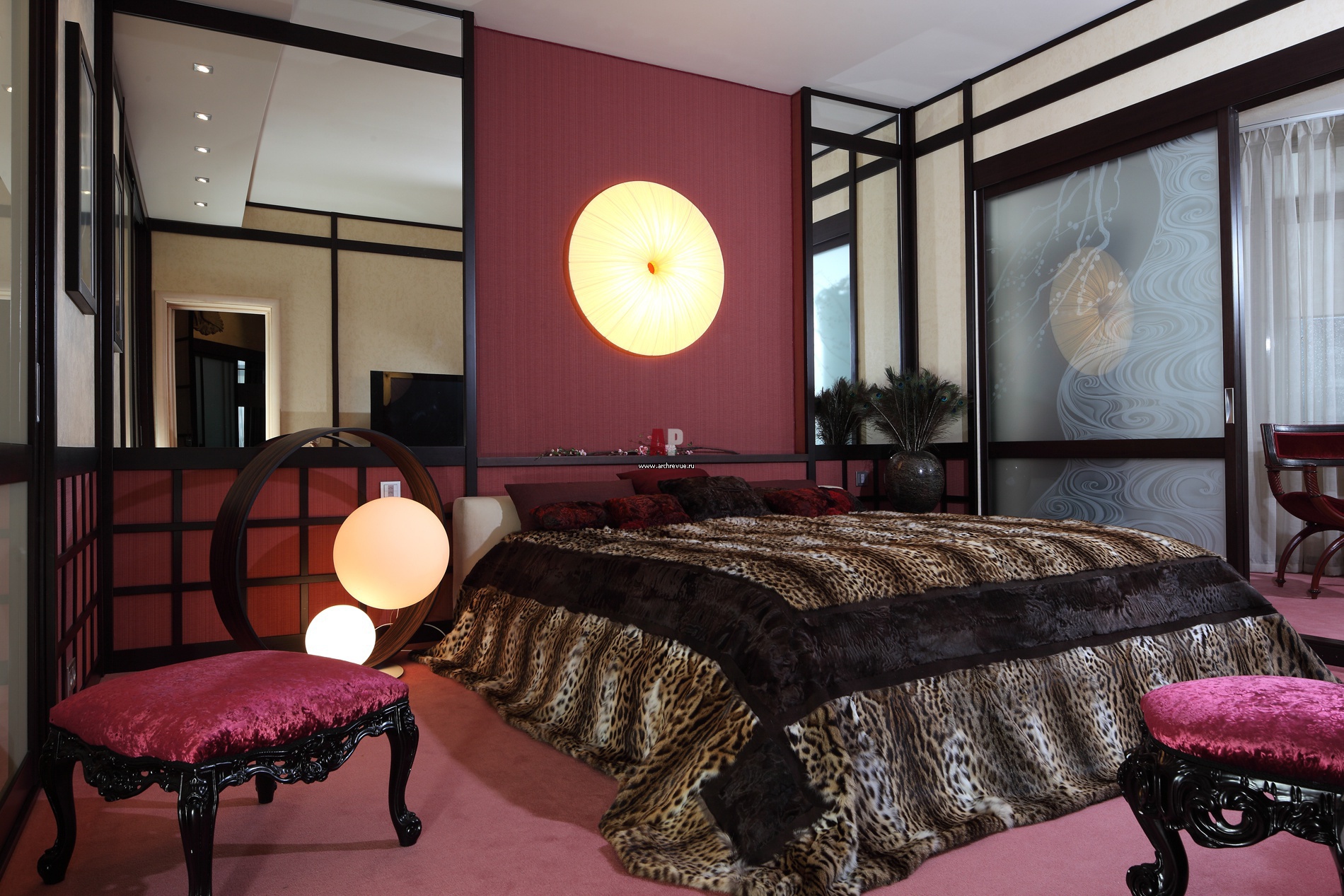 Фото интерьера спальни в восточном стиле. За перегородкой из стекла находится гардеробная. Матовое стекло украшено пескоструйным орнаментом по эскизам архитекторов, изготовление Lumi.