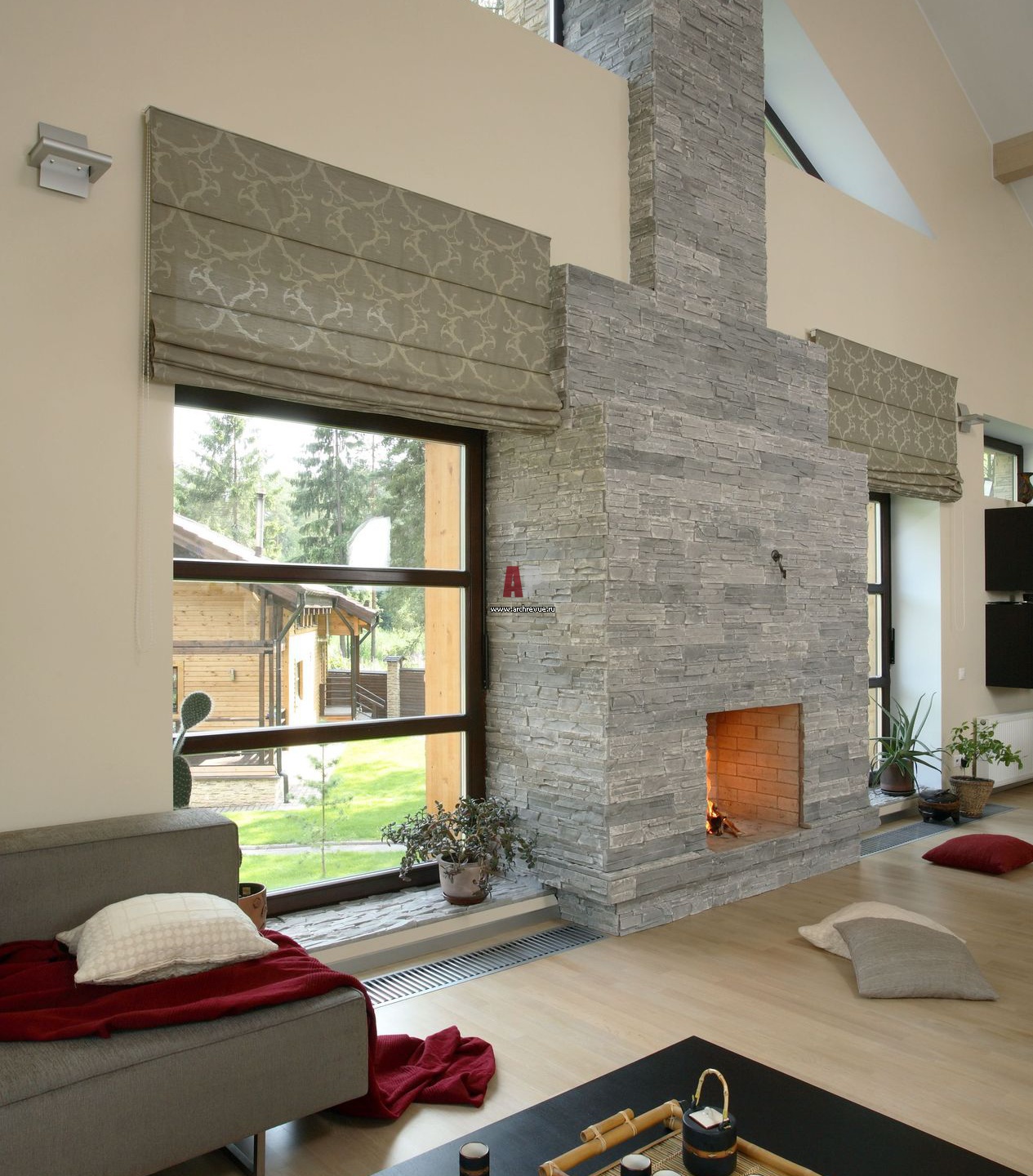 В отделке общественных зон — гостиной, холлов, коридоров — использован искусственный камень с фактурой песчаника «Скалистая гора», поставщик Kamrock. Этот декоративный прием объединяет интерьер дома с его экстерьером.