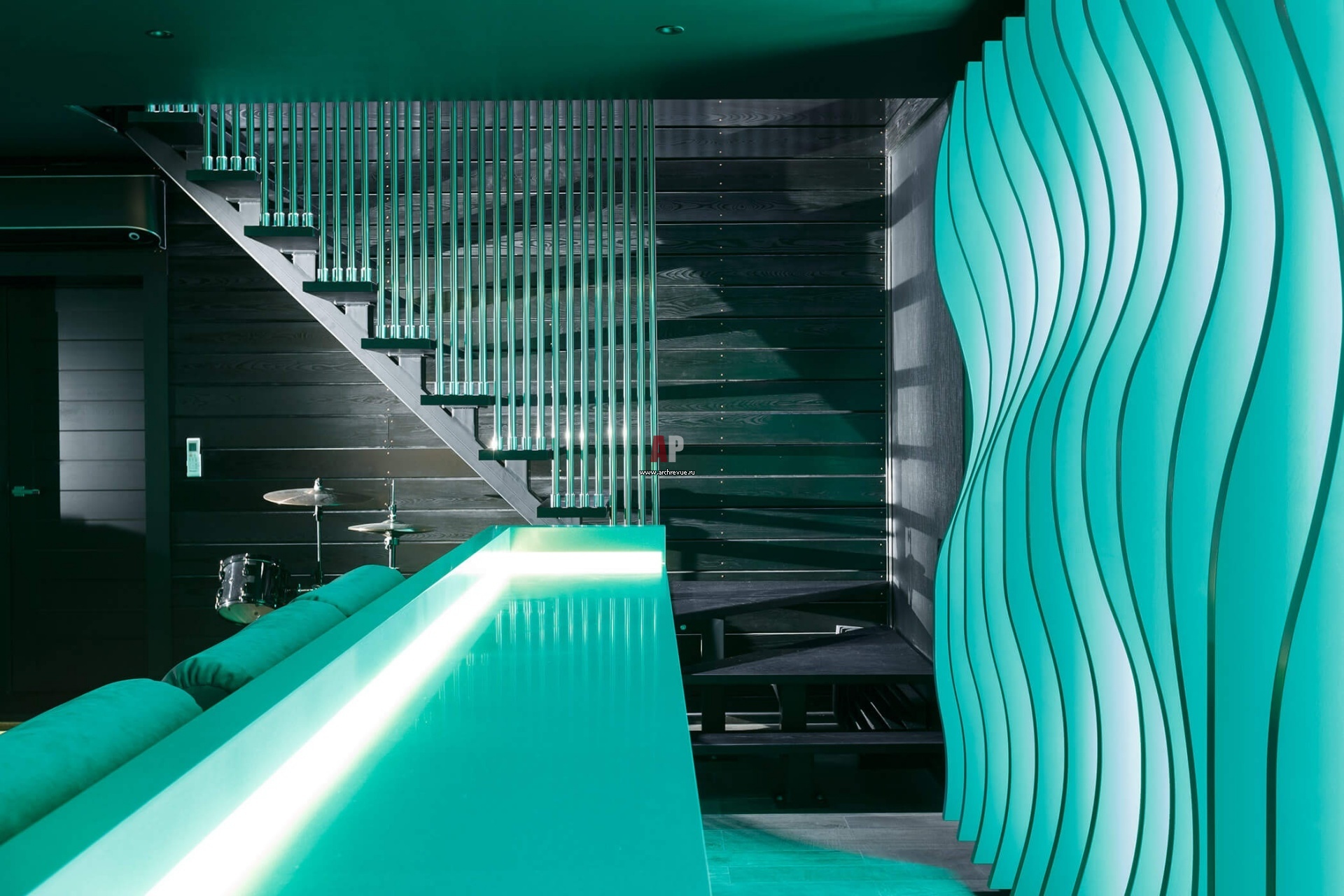 Интерьер домашнего кинотеатра напоминает модный ночной клуб. Параметрические светодиодные RGB-панели превращают традиционный интерьер в футуристическое пространство. Лестница с ограждением из металлических тросов ведет в спальню в мансарде.