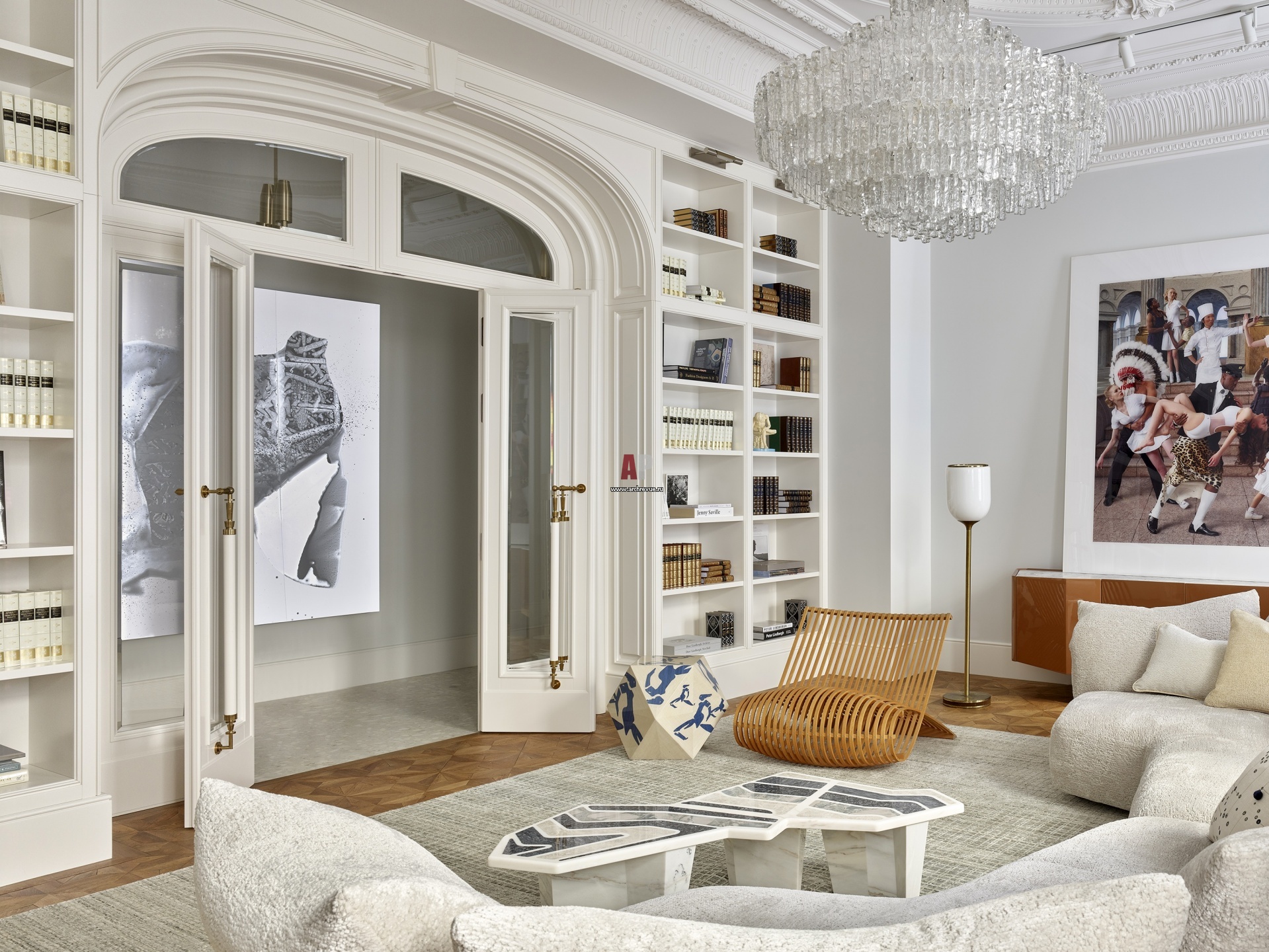Арочный портал с белыми филенкам отделяет гостиную от коридора. На комоде цифровой коллаж AES+F.