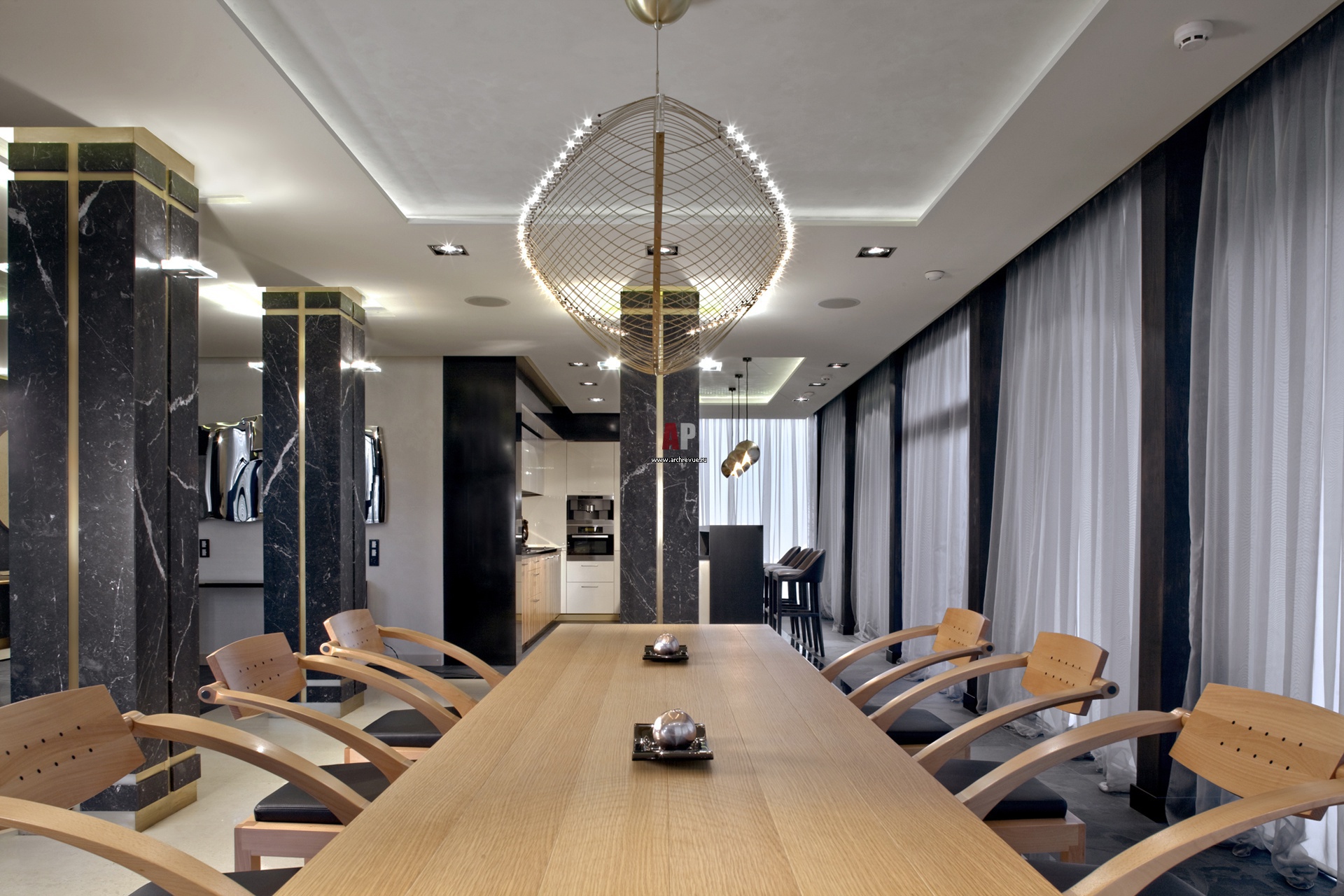 Дизайн интерьера столовой в стиле ар-деко. Вдоль трехметрового стола из светлого дерева расставлены знаменитые стулья от архитектора Массимо Сколари, сделанные для фабрики Giorgetti. Над столом «парит» двухметровый металлический дирижабль от Quasar.