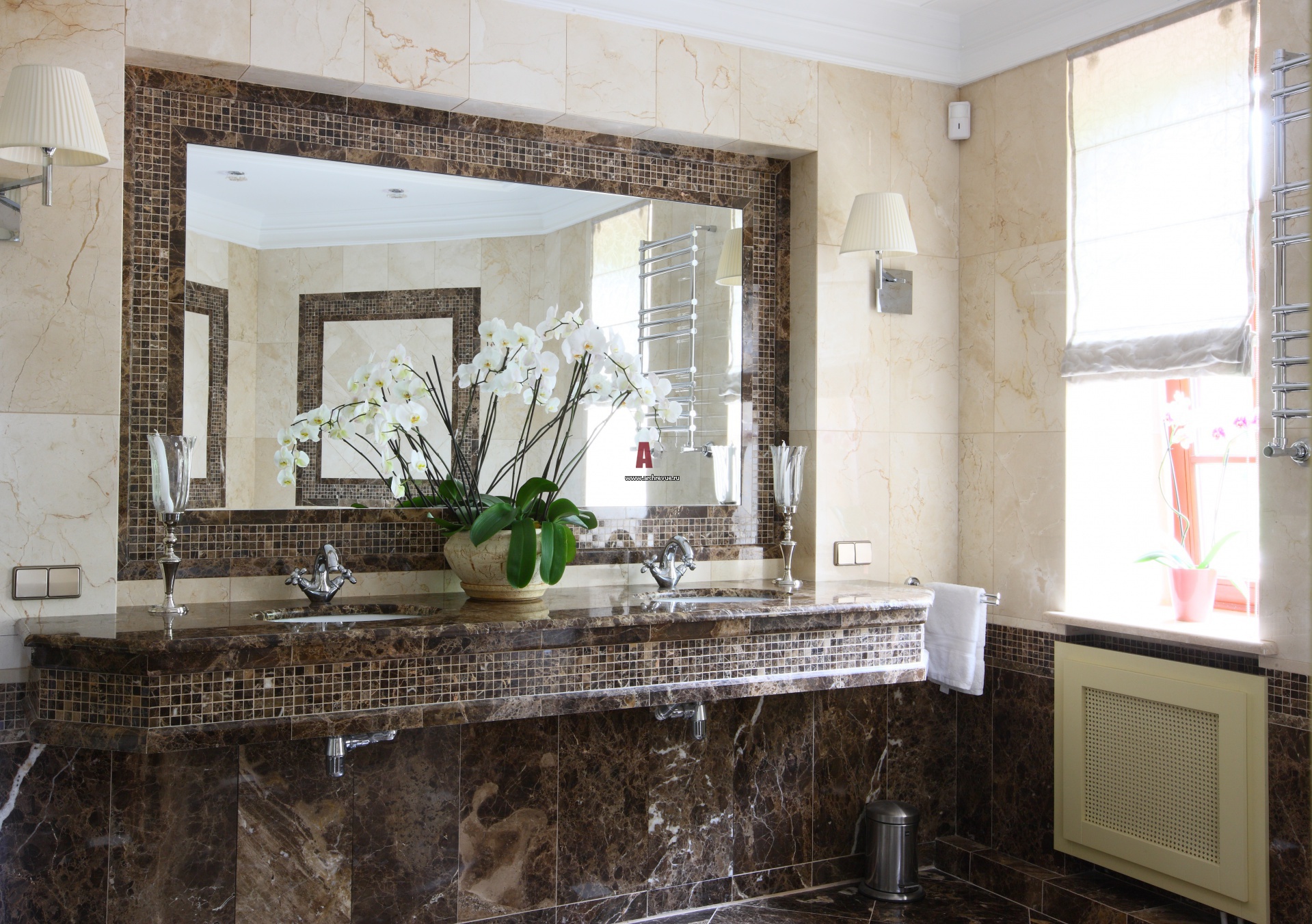 Интерьер ванной комнаты в классической усадьбе выполнен в сдержанной манере на контрасте двух сортов мрамора. Сантехника, Duravit, Hansgrohe.
