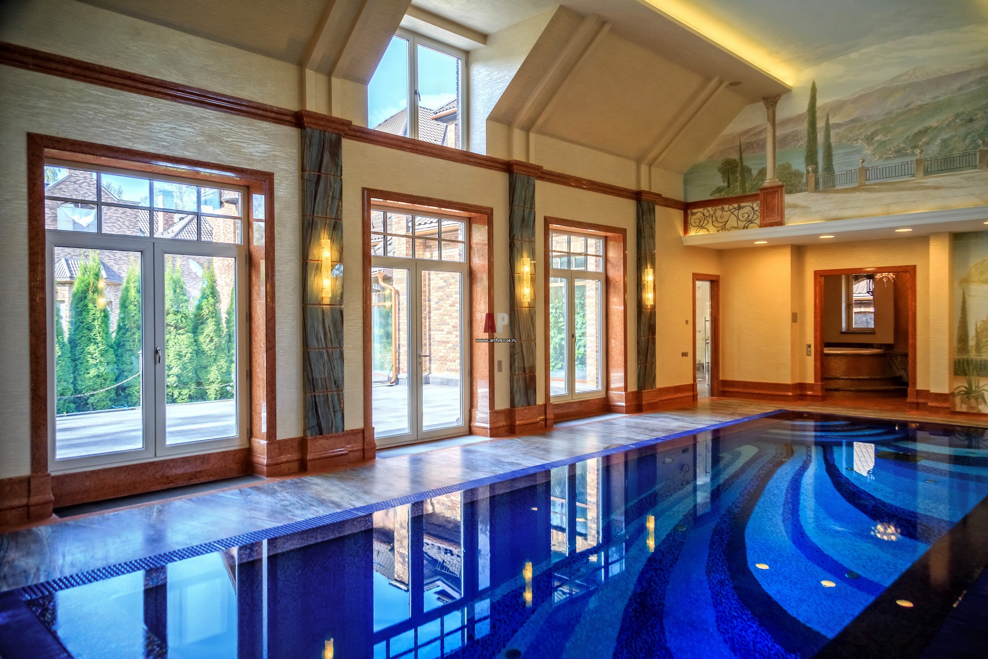 Бассейн расположен в пристройке и имеет панорамное остекление. Оконные проемы оформлены мрамором, фризы украшены ручной росписью.