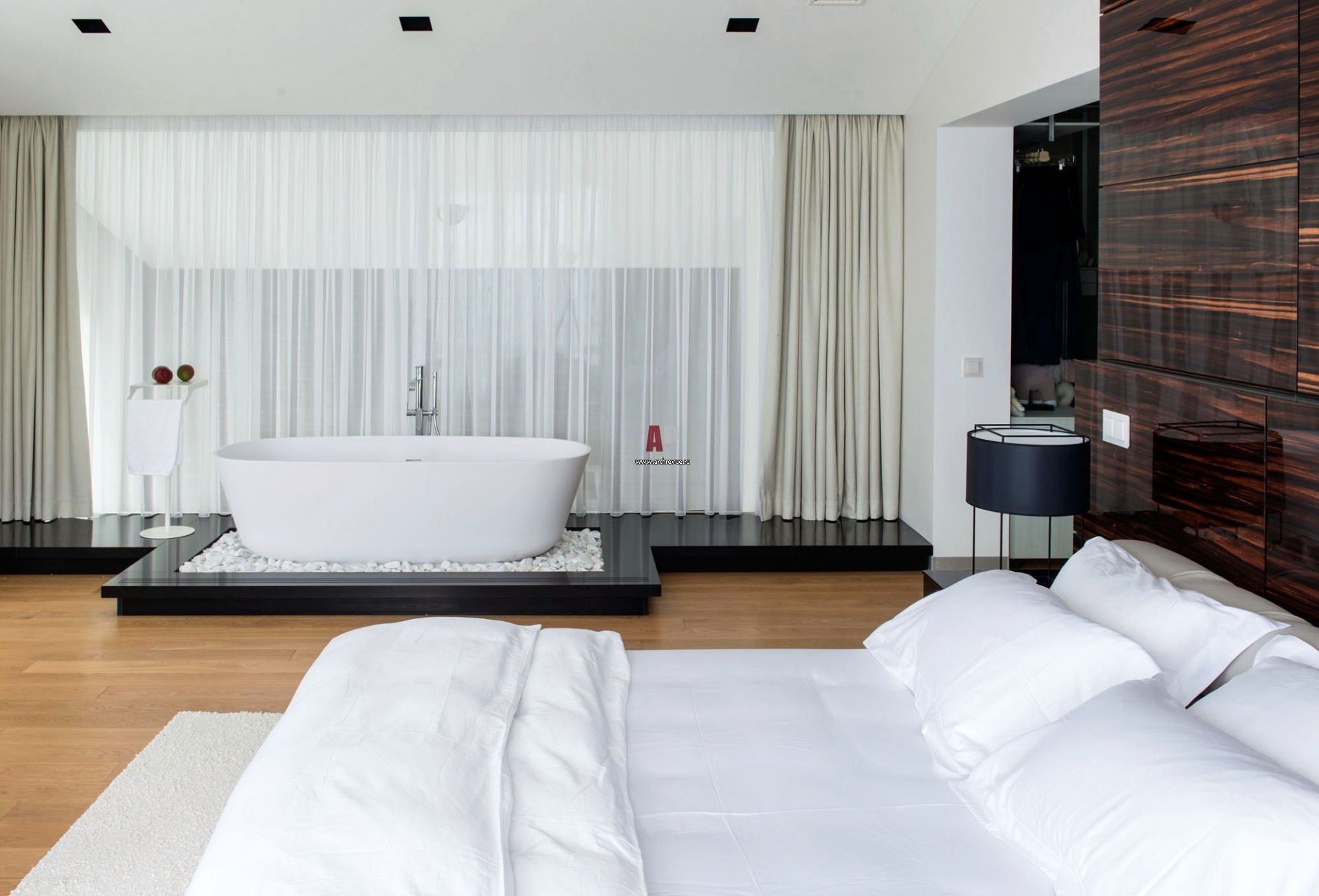 Ванна размещена в пространстве спальни. Окно обращено на гостиную. Сантехника, Antonio Lupi.